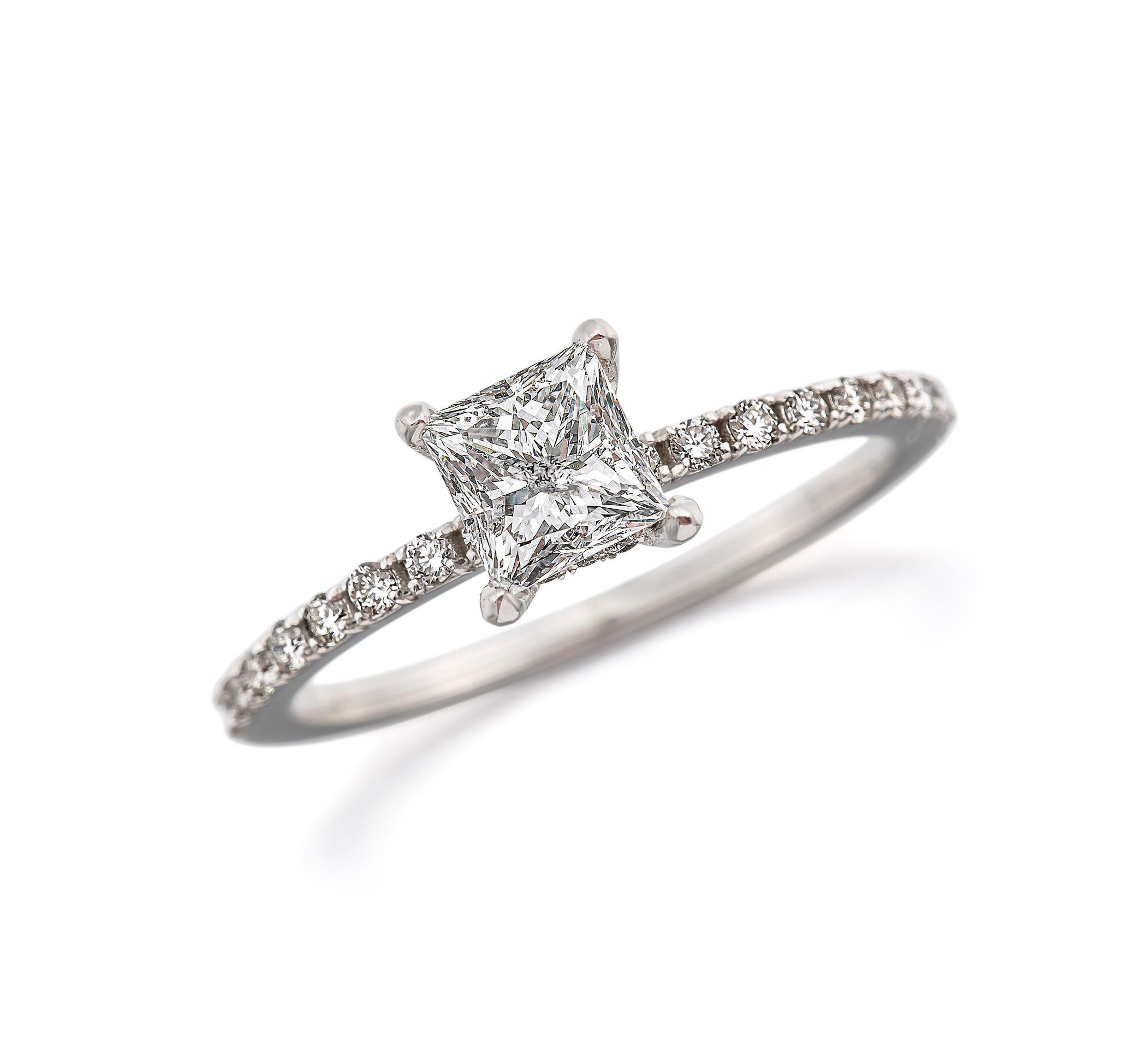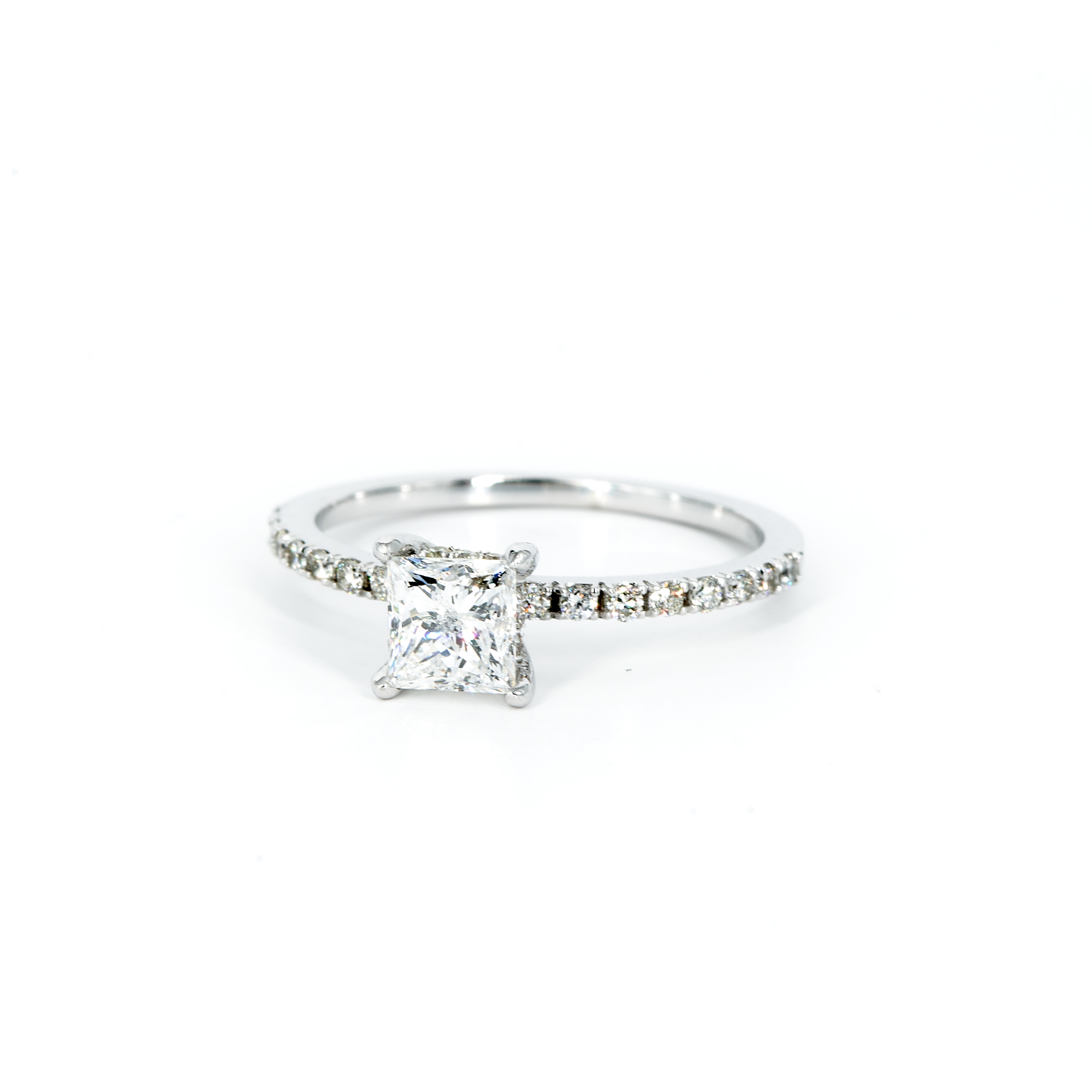 Kratzern. Vereinzelt Gussporen. Diamant im Prinzess-Schliff mit äußeren Merkmalen.
