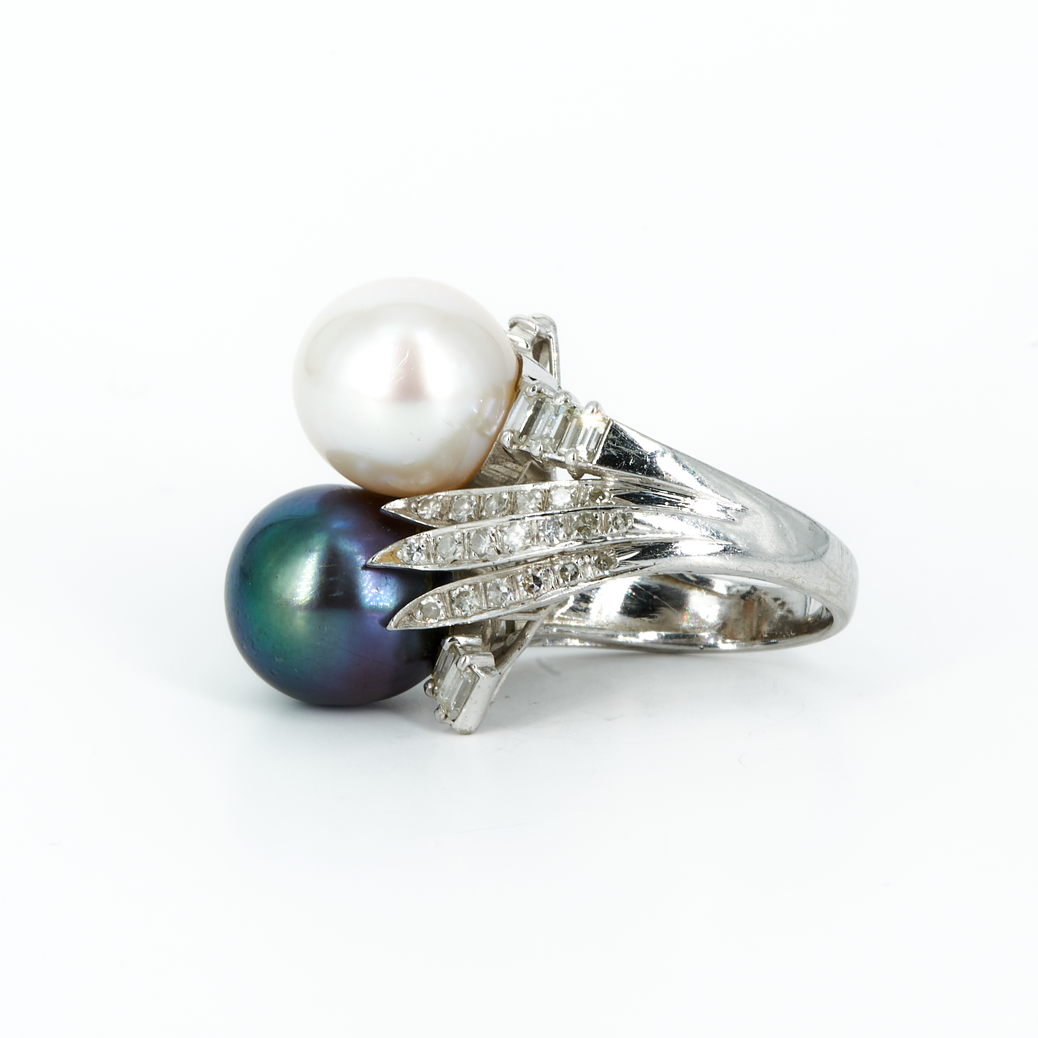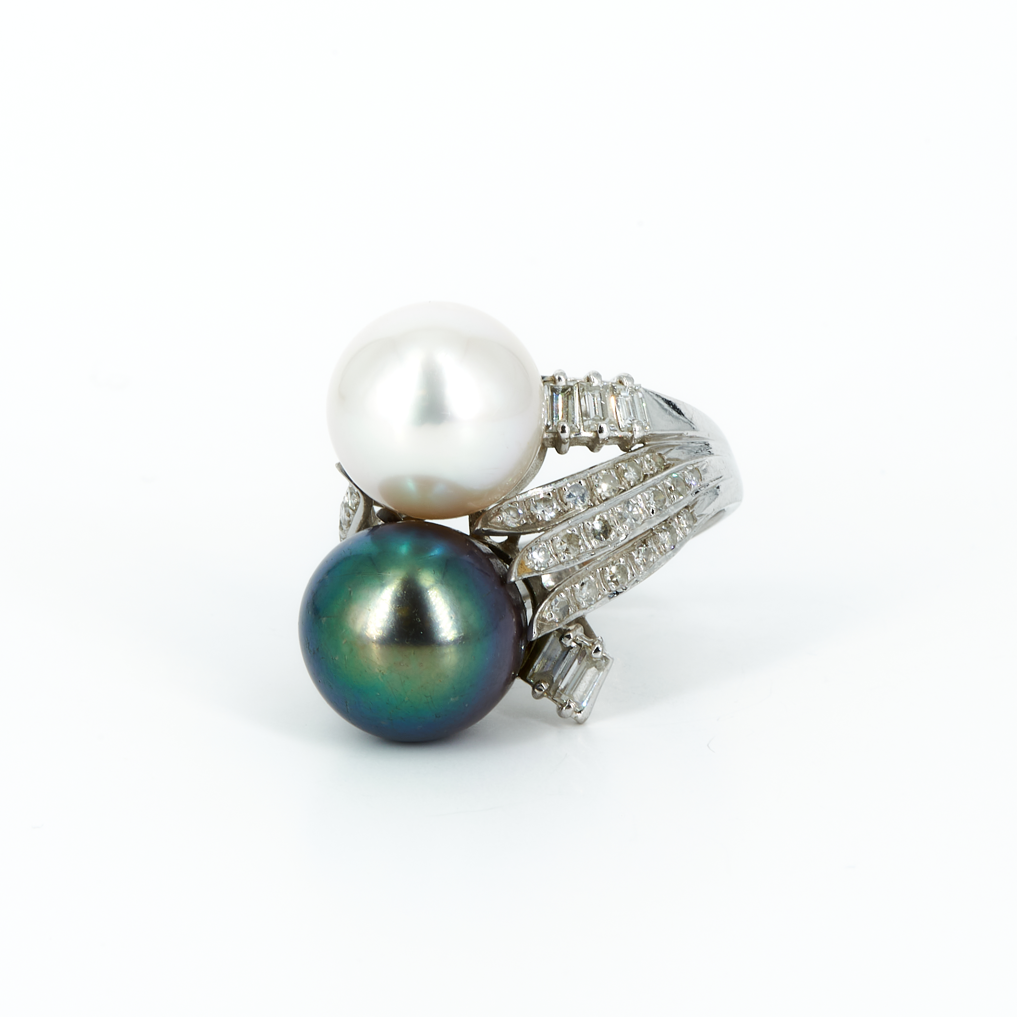 Org. Substanzen: 1 Tahiti-Zuchtperle und 1 Südsee-Zuchtperle, unrund Ø ca. 12,4 - 12,9 mm, weiß-rose und olivgrün.