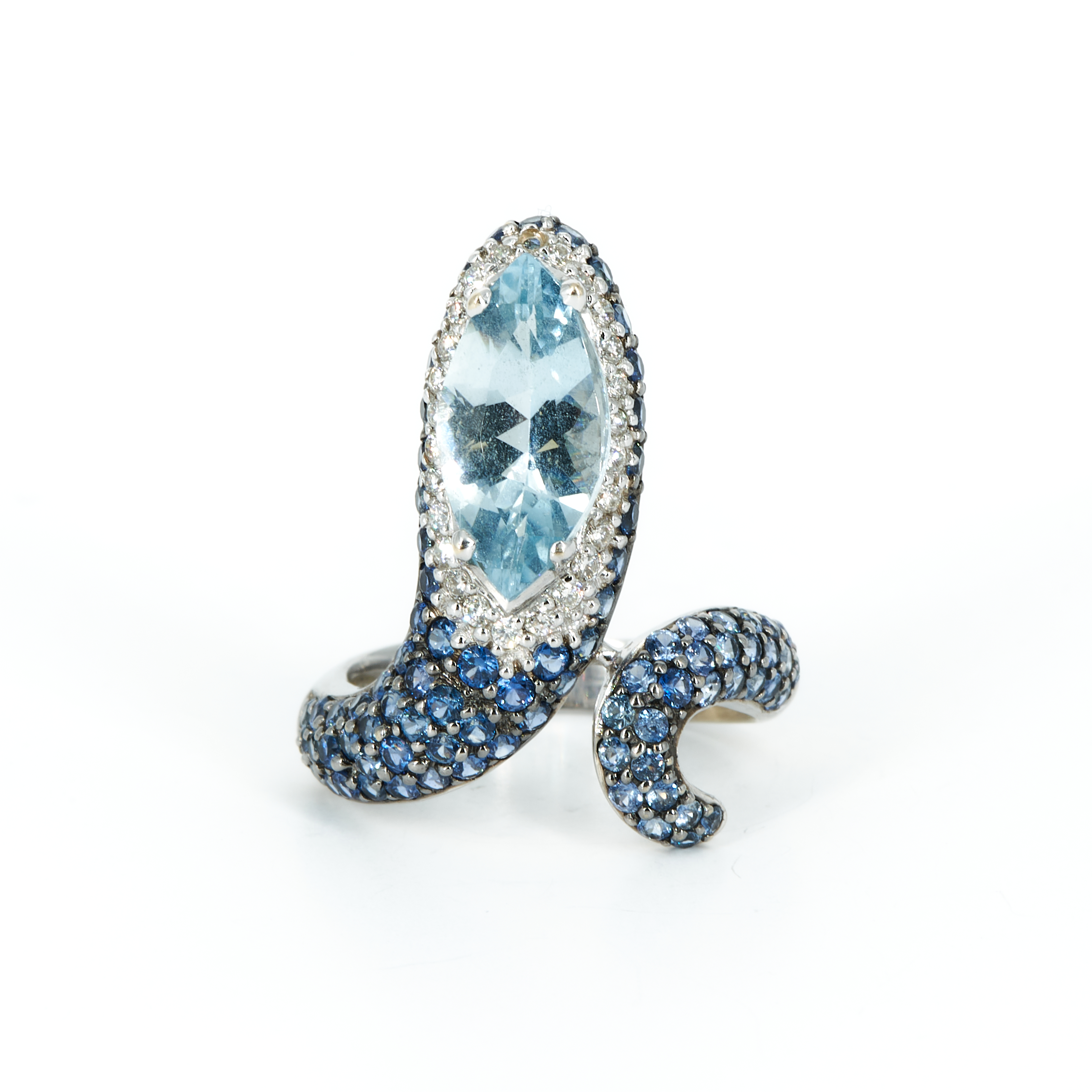 Edelsteine: 1 Farbstein im Navette-Schliff, wohl Aquamarin ca. 3,5 ct., 84 runde, facettierte Farbsteine, blau, Ø ca. 1,5 - 1,8 mm.