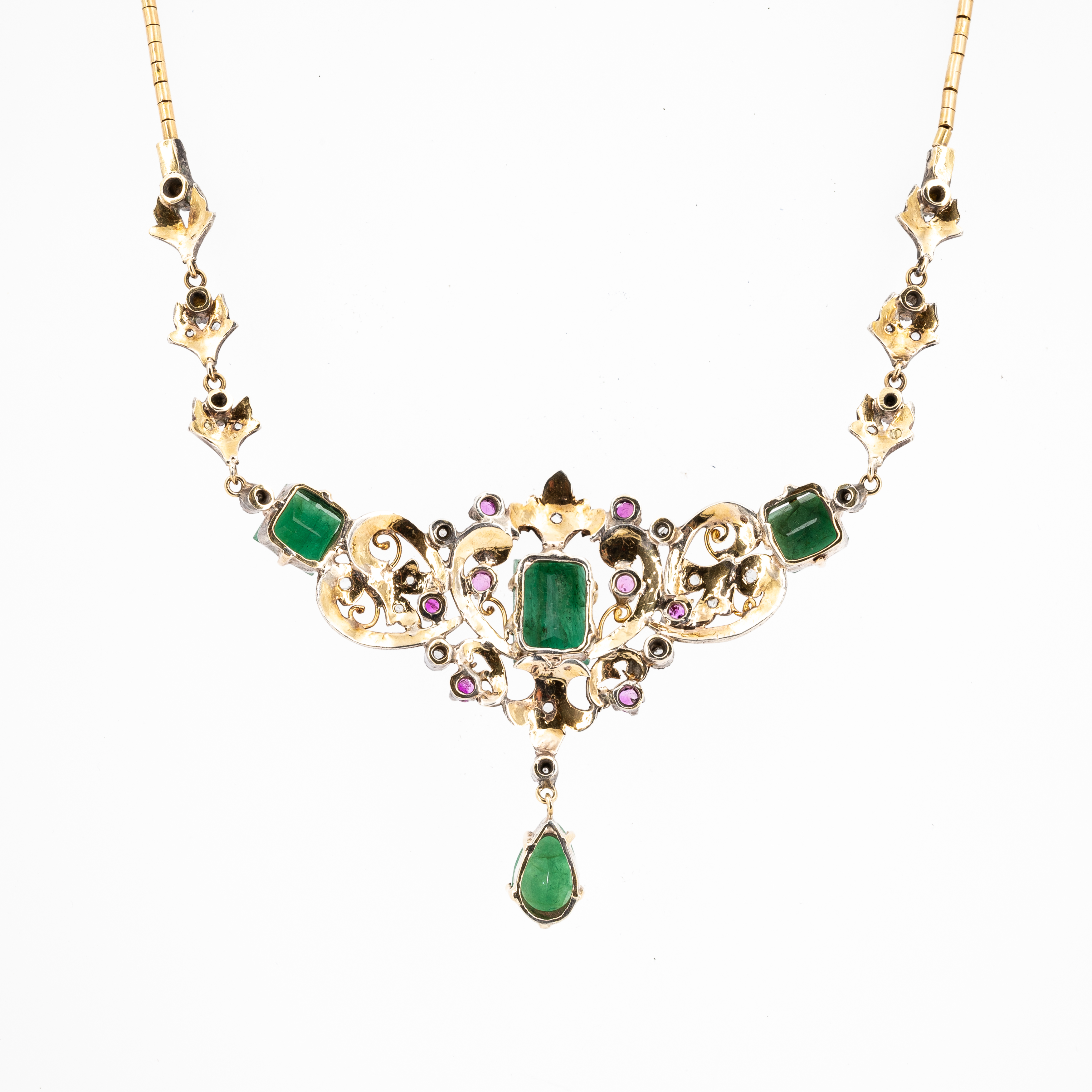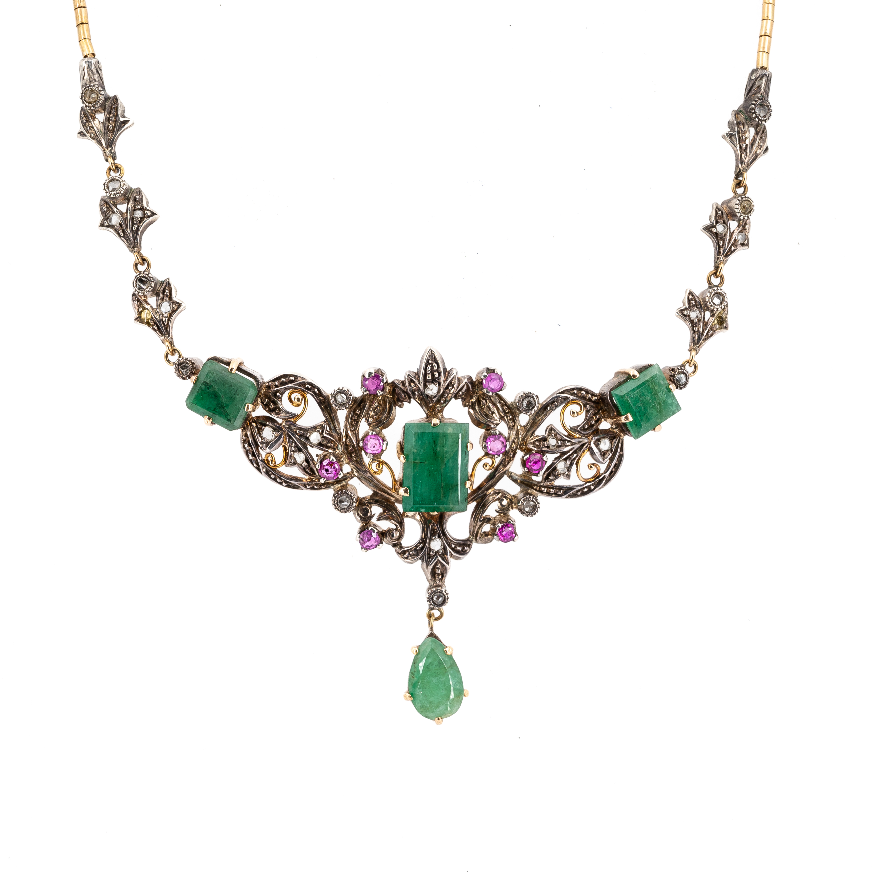 Edelsteine: 4 Smaragde im Emerald- und Tropfen-Schliff zus. ca. 7,4 ct., 8 runde, facettierte Farbsteine, wohl Rubine, Ø ca. 2,4 - 2,9 mm.