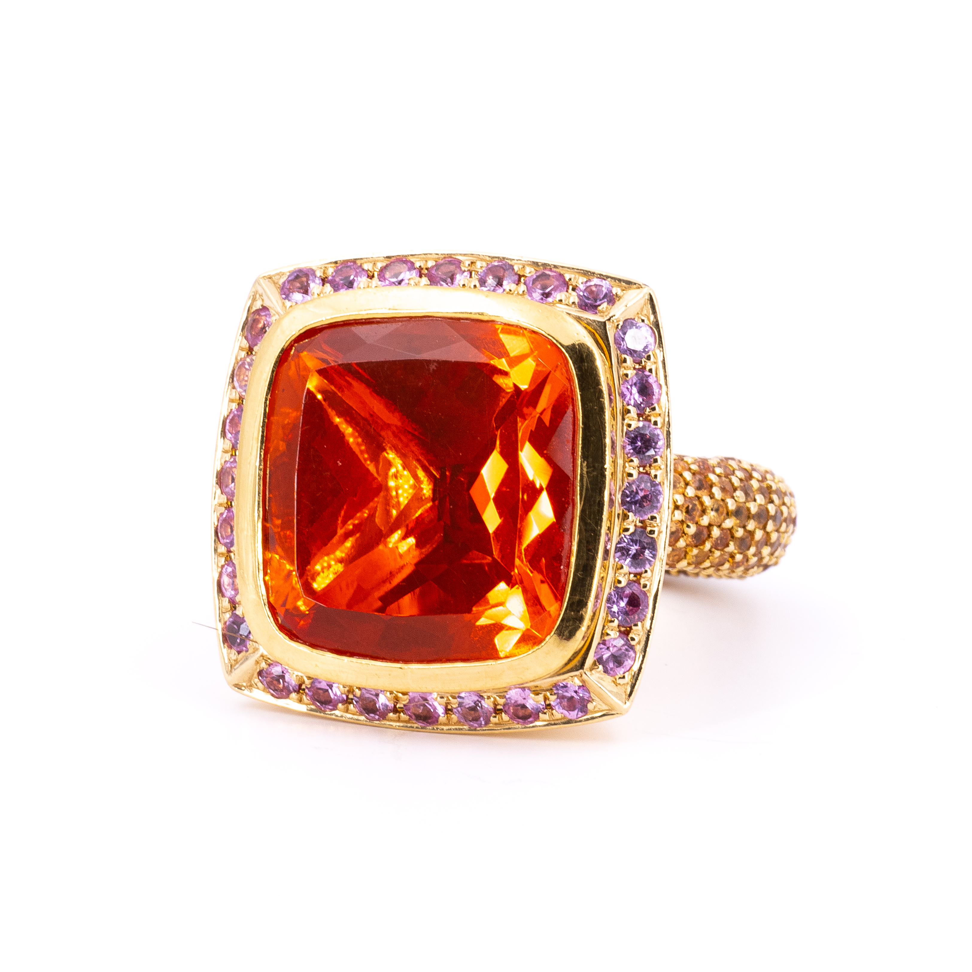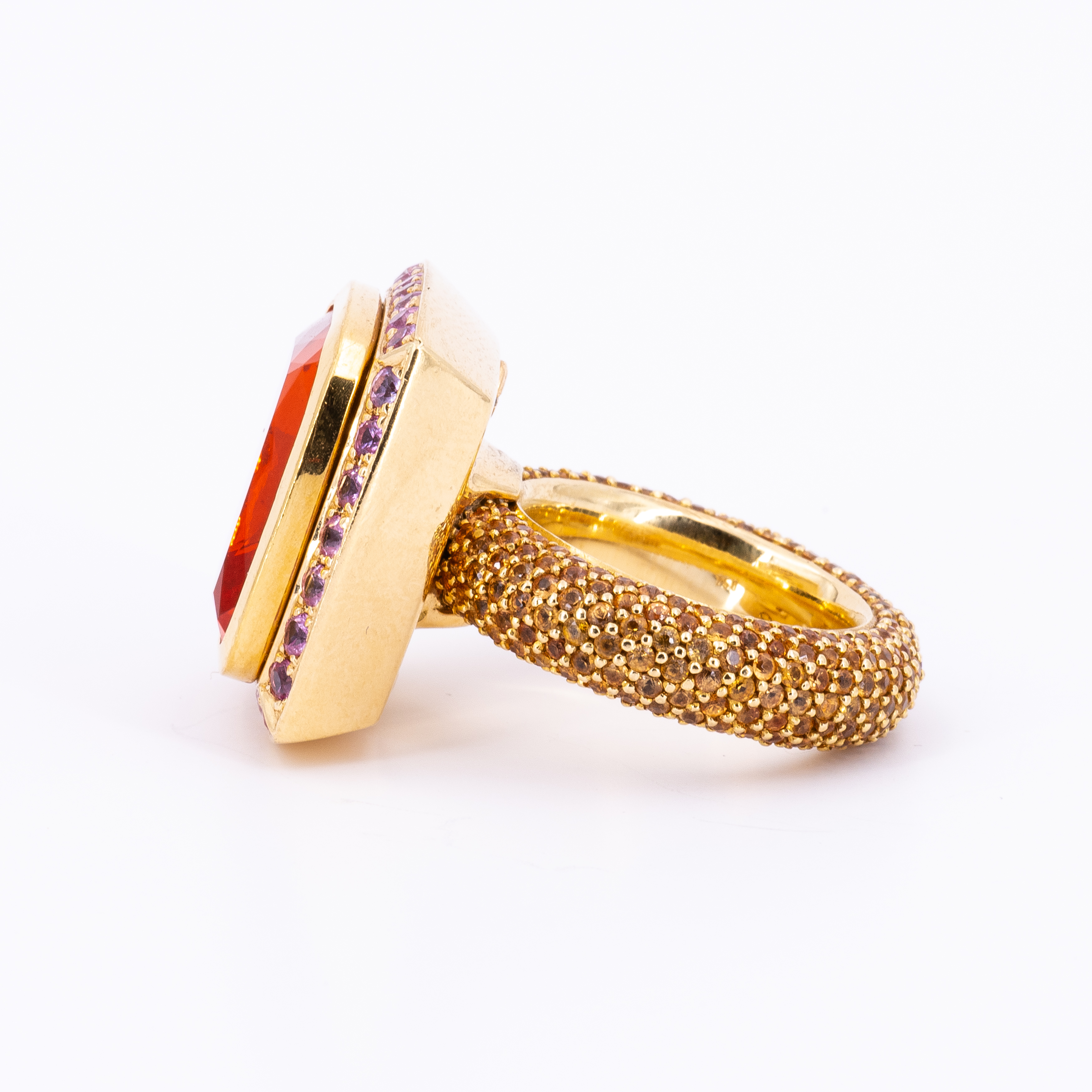 Edelsteine: 1 rechteckig, facettierter Feueropal ca. 18,0 x 17,0 mm, 305 runde, facettierte Farbsteine, rosa und cognacfarben, wohl Saphir Ø ca. 1,2 - 2,1 mm.
