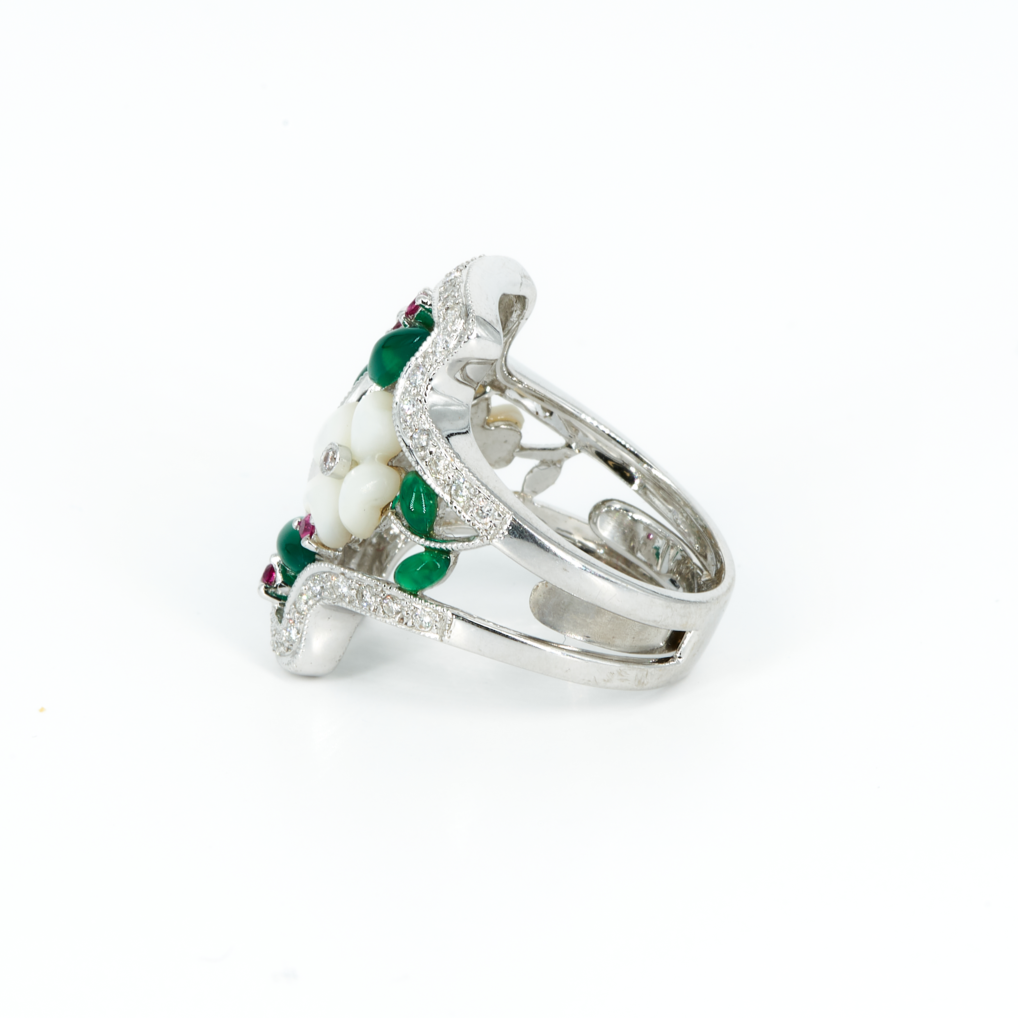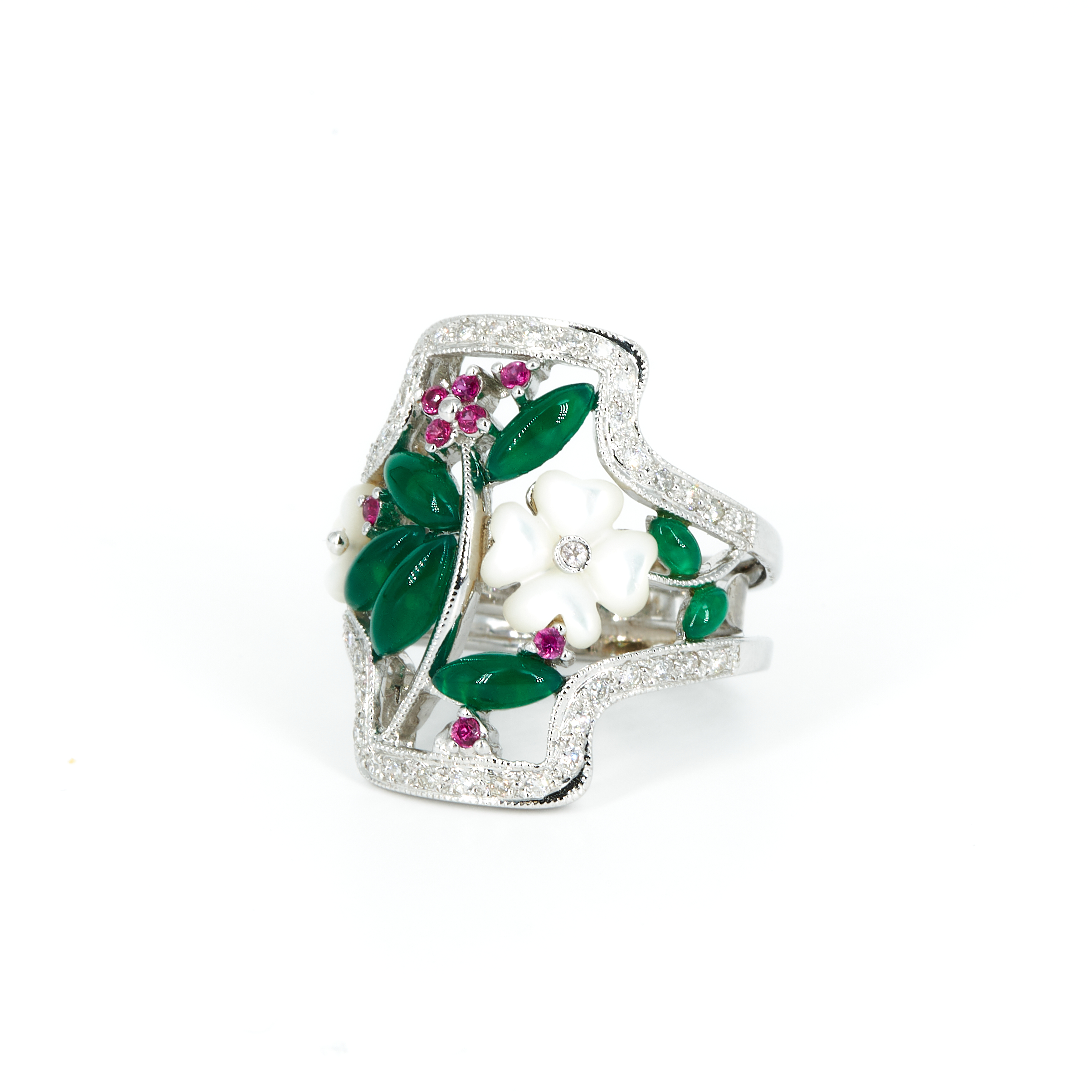 Edelsteine: 8 runde, facettierte Farbsteine, wohl Rubin zus. ca. 0,15 ct., 7 Farbstein-Blüten, wohl Mondstein ca. 3,4 - 4,8 x 2,5 - 3,1 mm, 7 Farbstein-Blätter, wohl Chrysopras ca. 3,5 - 7,0 x 1,9 - 3,2 mm.