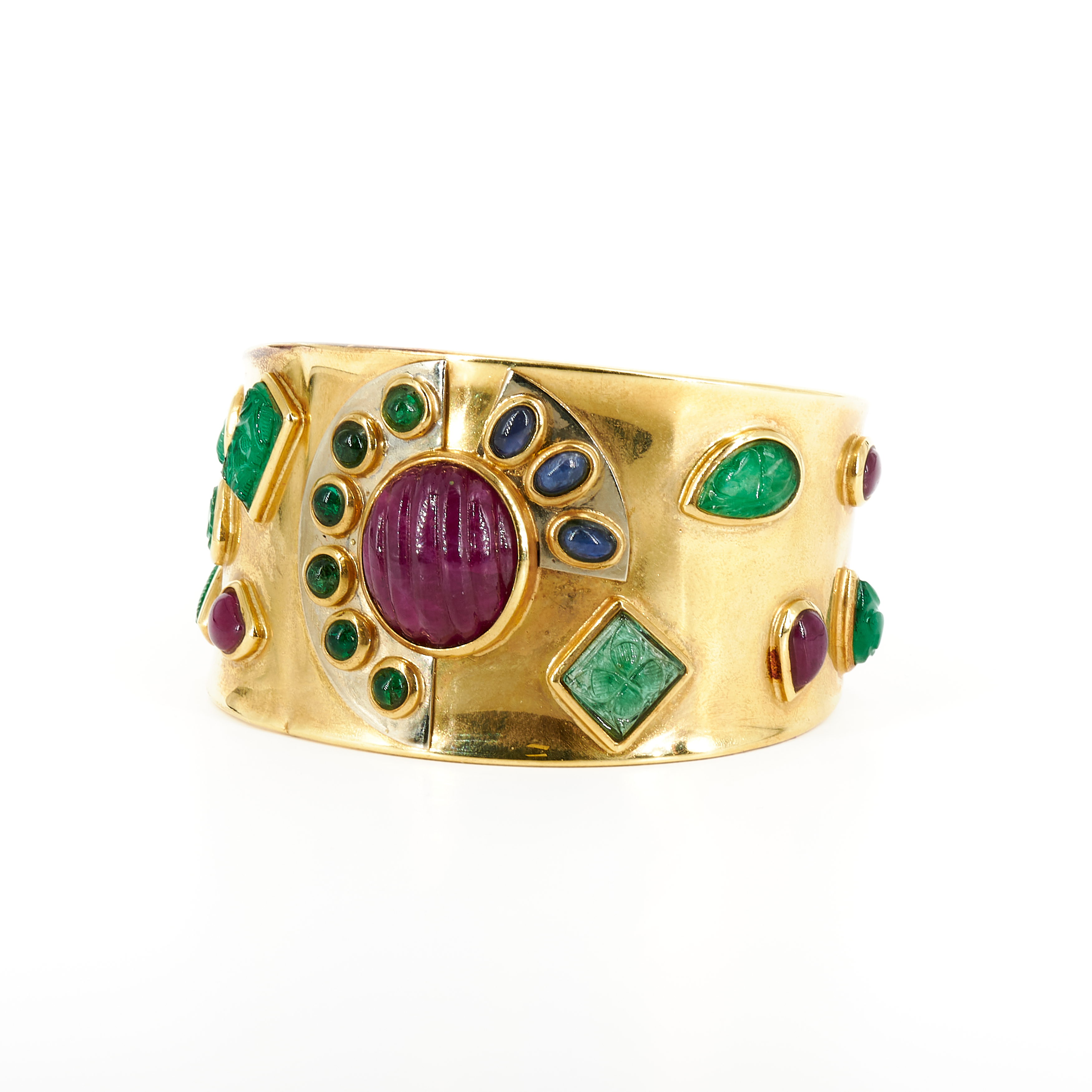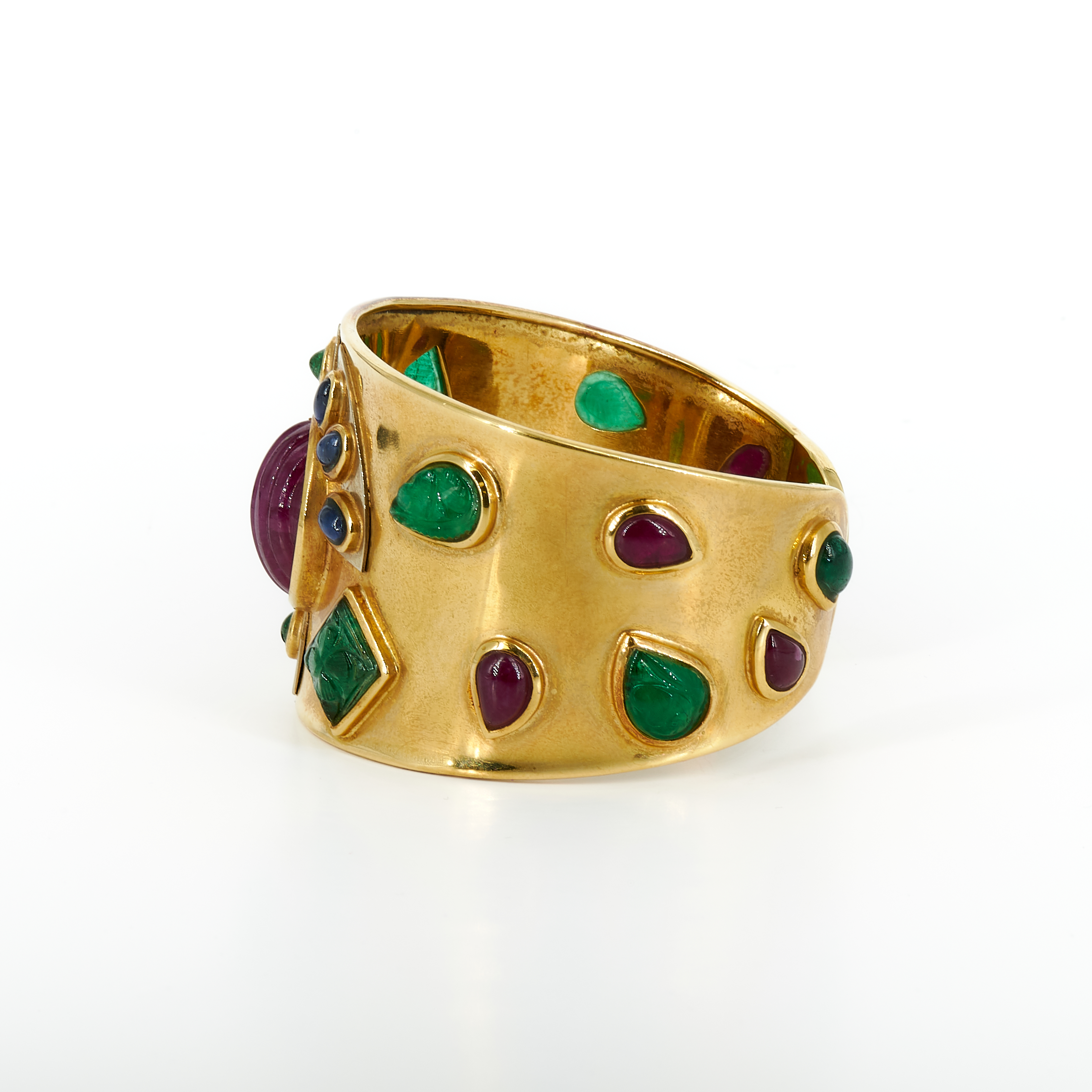 Edelsteine: 25 Farbstein-Cabochons, rund, oval, tropfenförmig, herzförmig und rechteckig, zum Teil geschnitzt, wohl Rubin, Saphir und Smaragd ca. 3,5 - 17,3 x 3,5 - 15,5 mm.