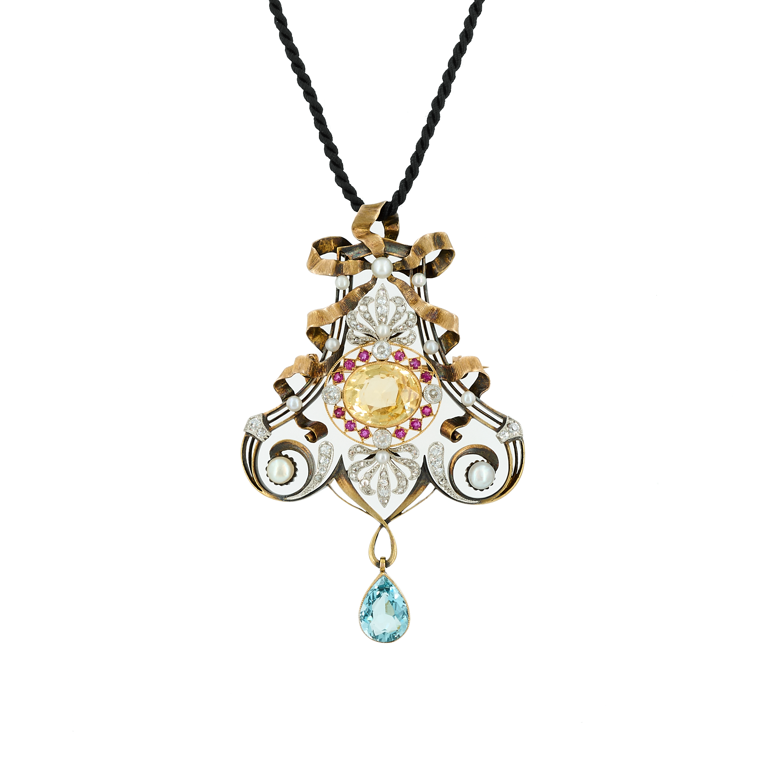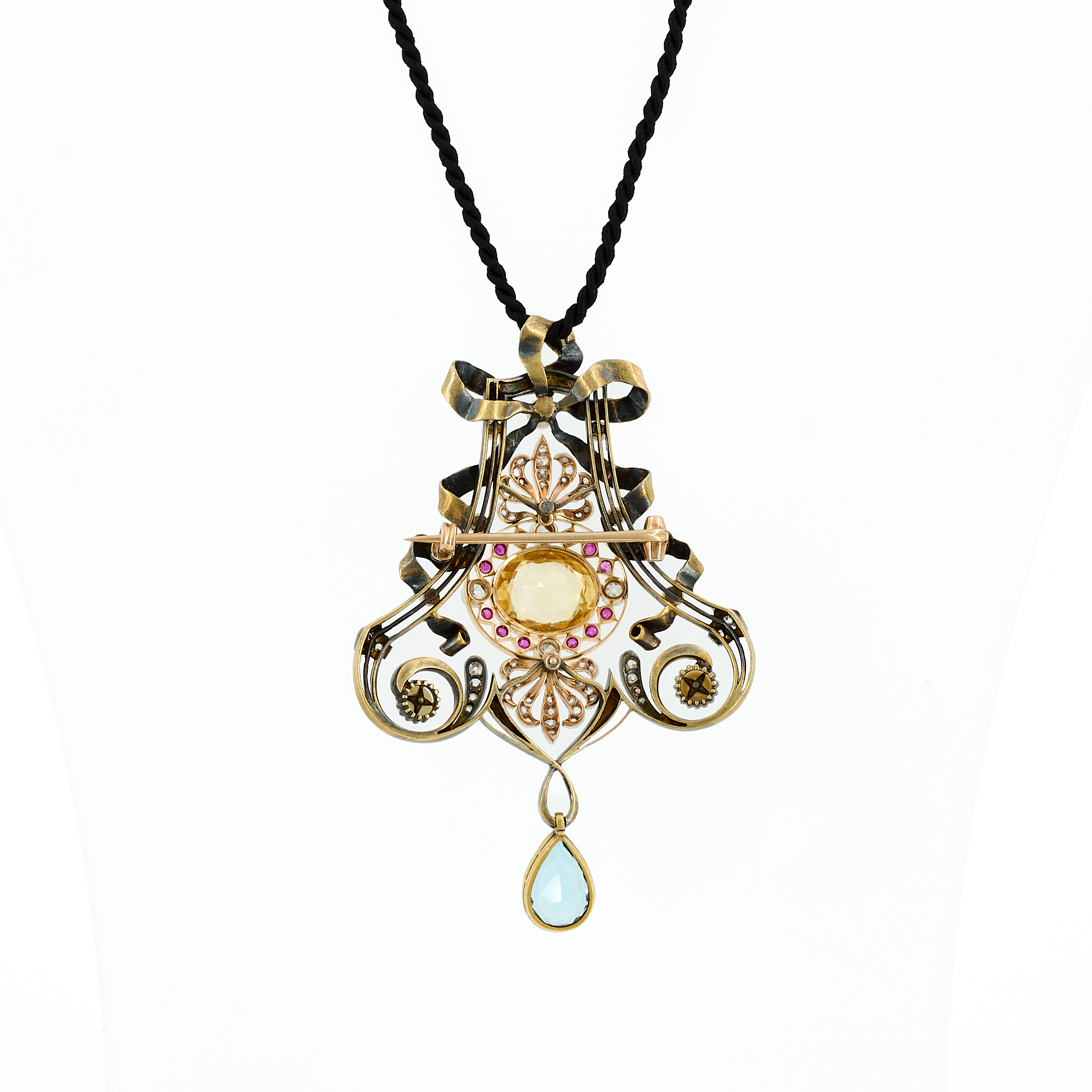 Edelsteine: 1 ovaler, facettierter Citrin ca. 4,2 ct., 1 Topas im Tropfen-Schliff ca. 3,5 ct., 12 runde, facettierte, rote Farbsteine, wohl Rubine, Ø ca. 1,8 mm.