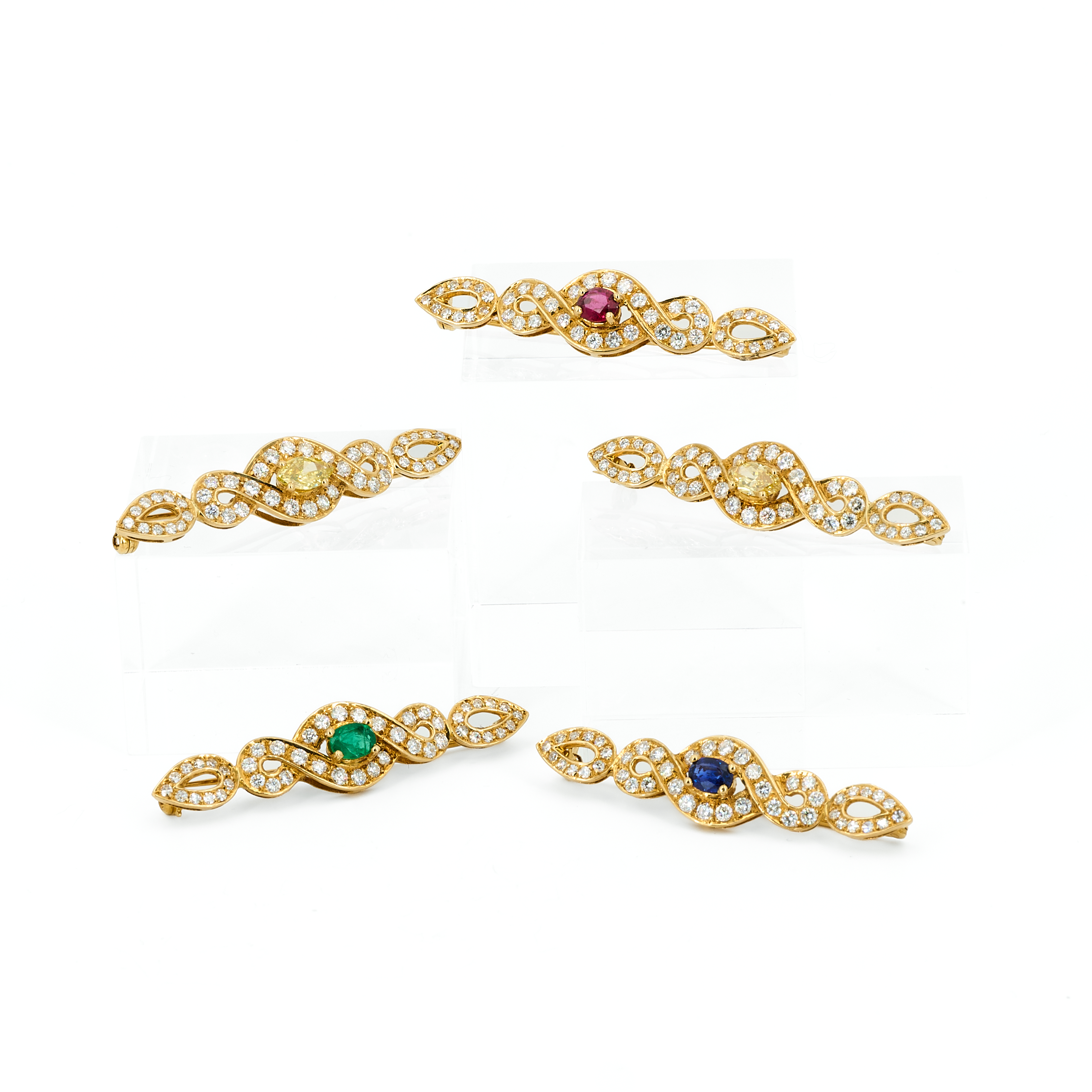 KONVOLUT AUS FÜNF FARBSTEIN-DIAMANT-BROSCHEN.