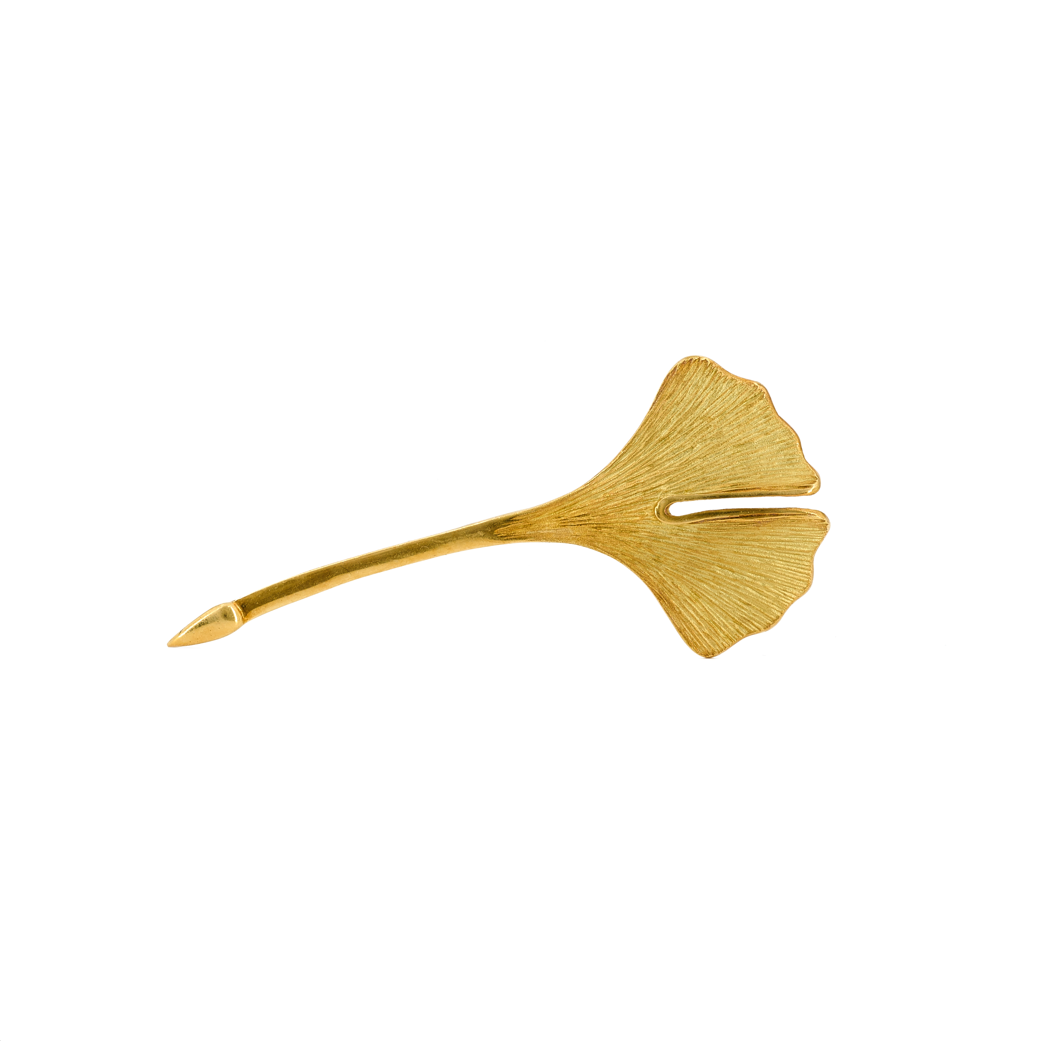Beschreibung: Brosche in Form eines Ginkoblatts. Punziert "OEKE WEIMAR". Anbei Rechnung von Juwelier