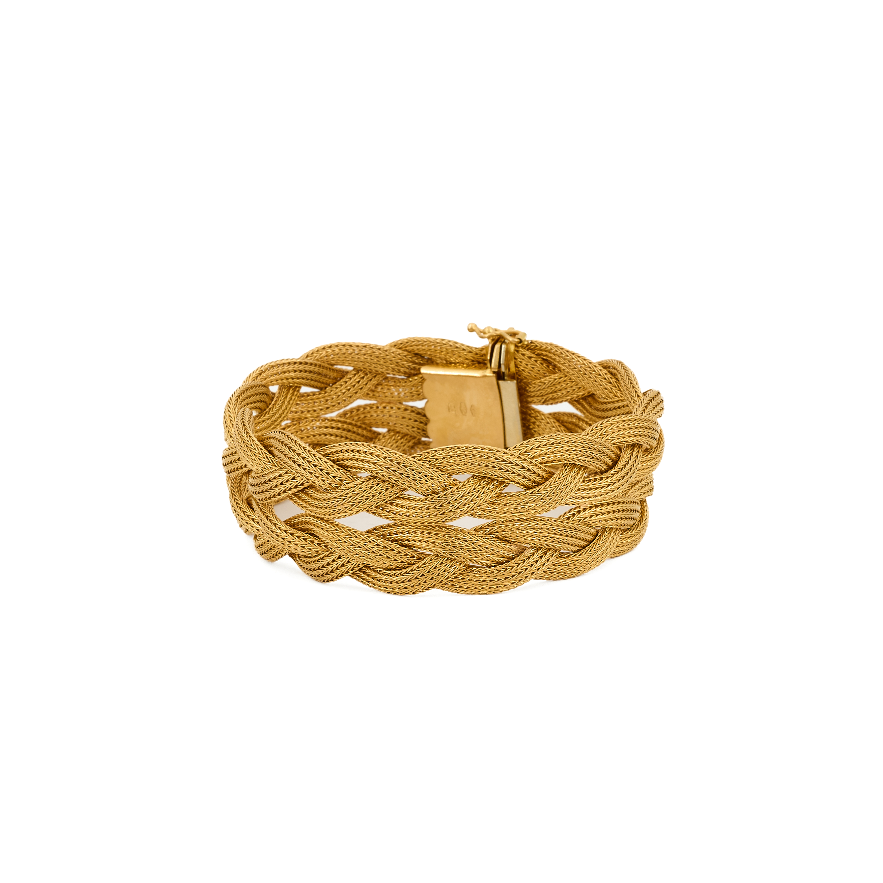Beschreibung: 4 geflochtene Goldstränge. Geschmeidiger Tragekomfort. Juwelierpunze "FF".