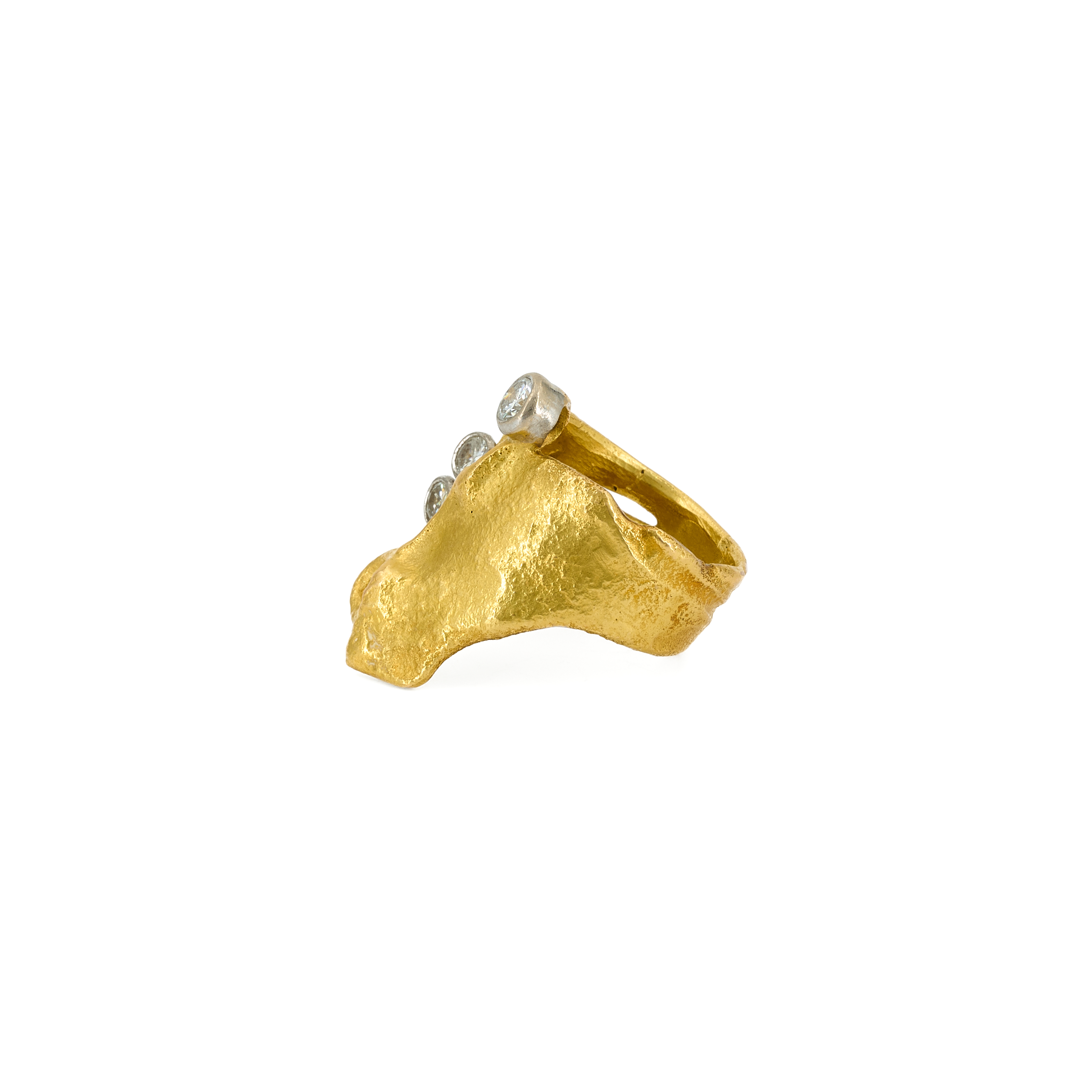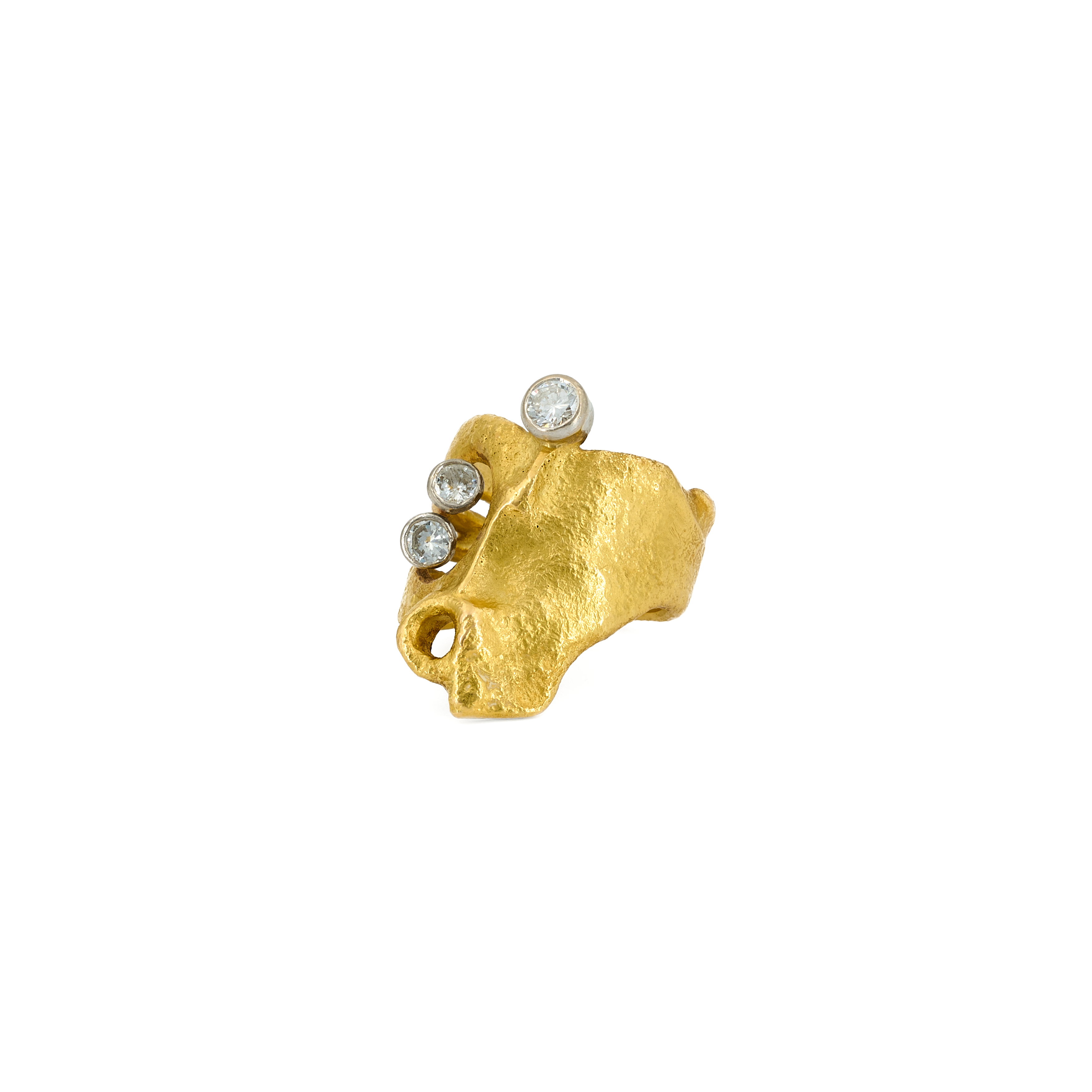 Beschreibung: Asymmetrisch, mattiert-gearbeitetes Goldschmiede-Stück. Juwelierpunze.