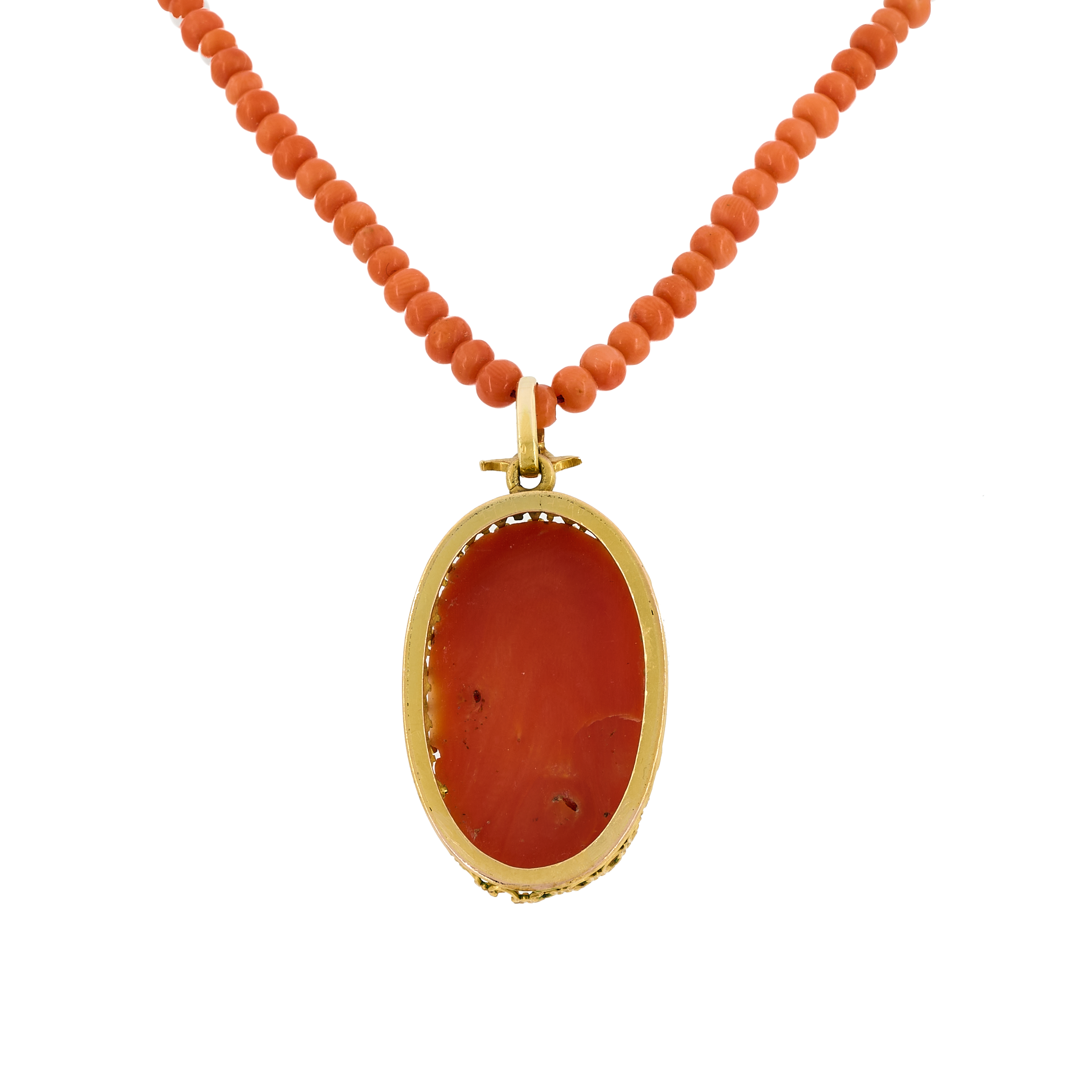Beschreibung: Kette aus Korall-Kugeln, daran ein ovaler Korall-Anhänger mit eingeschnitzter Frauenbüste, ringsherum umrahmt von Goldbordüren. Kettenschließe in Gestalt einer goldenen Hand.