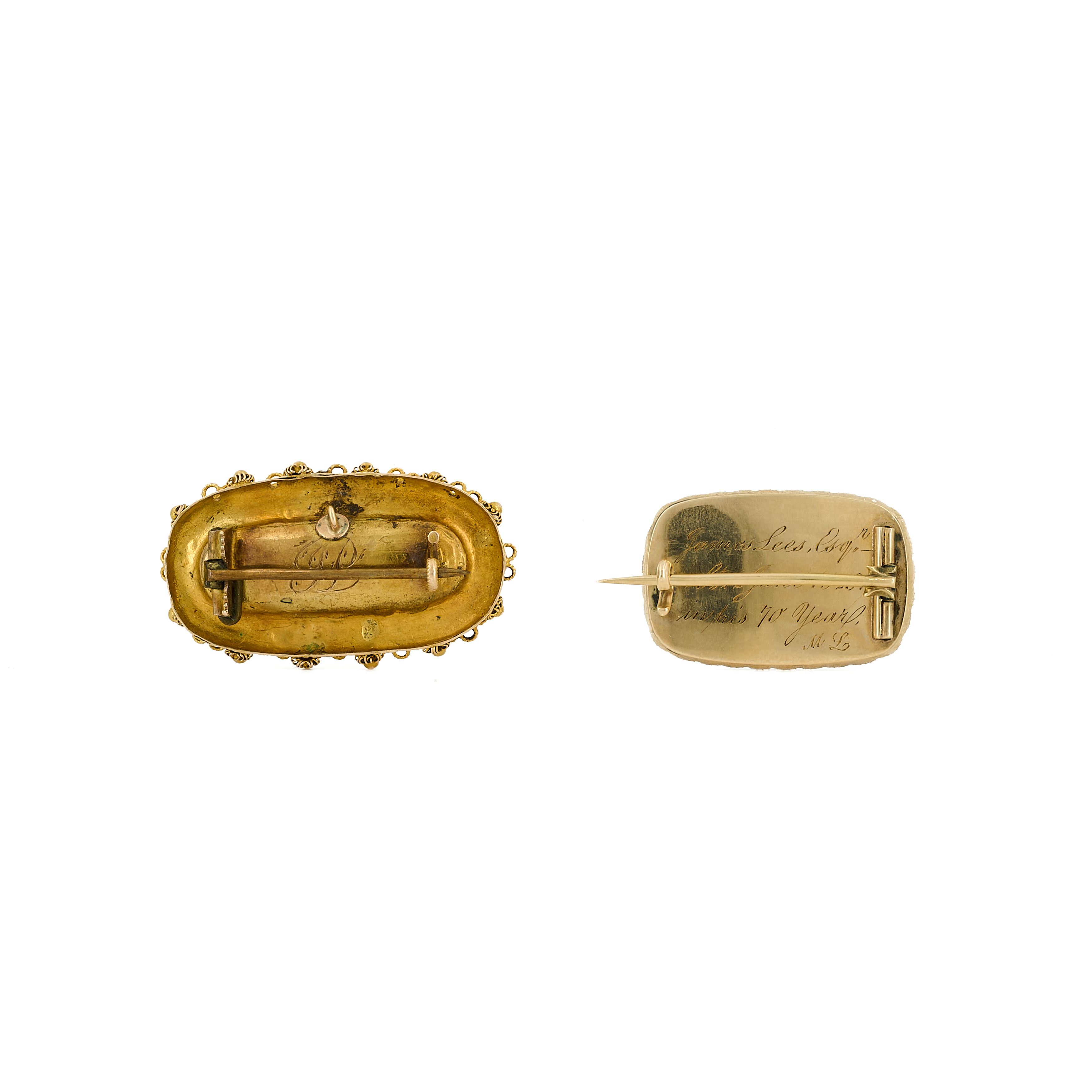 Beschreibung: 2 fein gearbeitete Trauer-Broschen, zentral jeweils eine Einlage aus geflochtenem braunem Haar unter Bergkristall. Eine Brosche schauseitig mit schwarz emailliertem Rahmen um die Haareinlage, darauf Goldgravur, umrahmt von Saatperlen. Rückseitig eingraviert "James Lees [...], obiit 12 June 1828 in his 70 year. ML". Die andere Brosche schauseitig mit detailreichem Dekor aus filigranen Golddrähten um die Haareinlage, besetzt mit Farbsteinen und einem Diamanten, rückseitig die Initialen "JL" eingraviert.