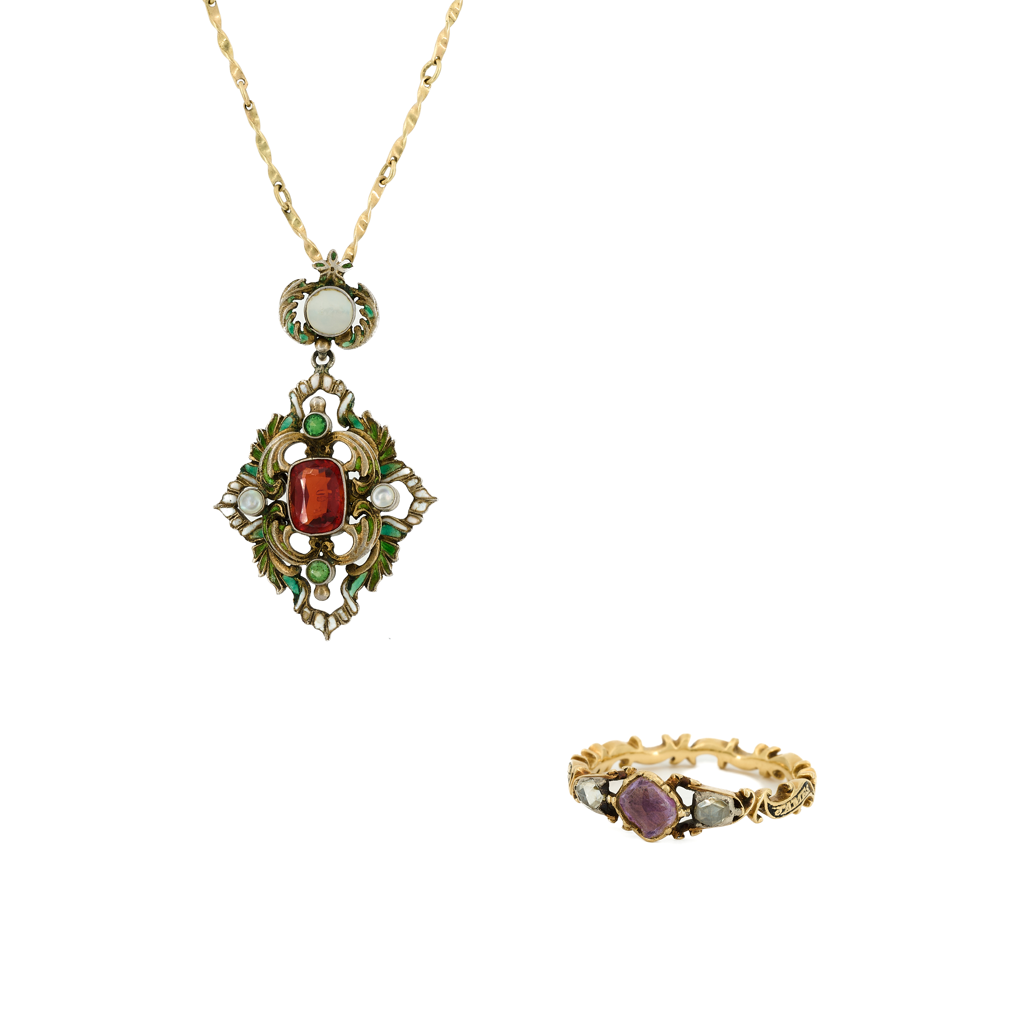 KONVOLUT: TRAUER-RING UND ART NOUVEAU-ANHÄNGERKETTE.