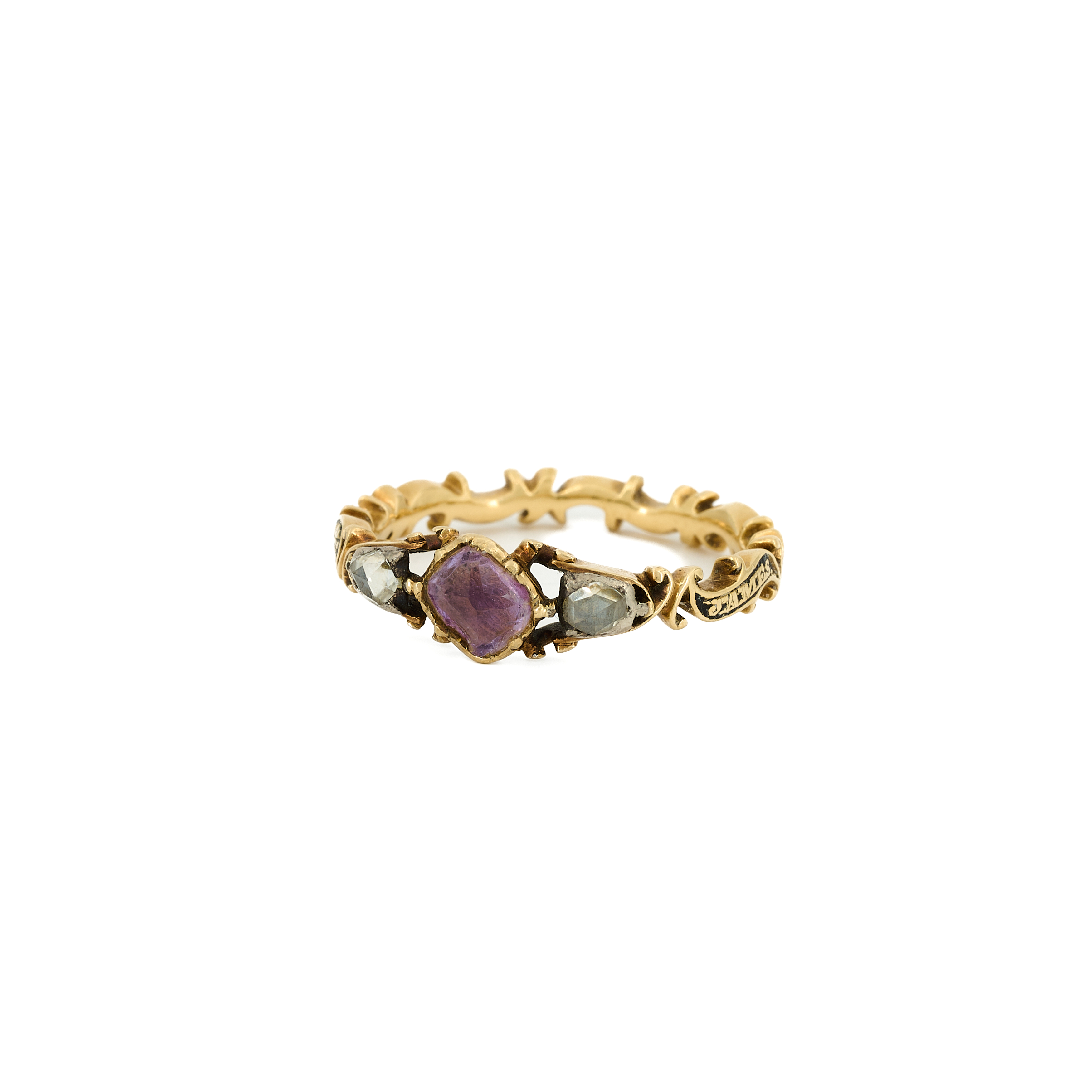 Gravur auf dem Ring teils nicht mehr leserlich, Emaille berieben. Violetter Farbstein zeigt muschelförmigen Ausbruch