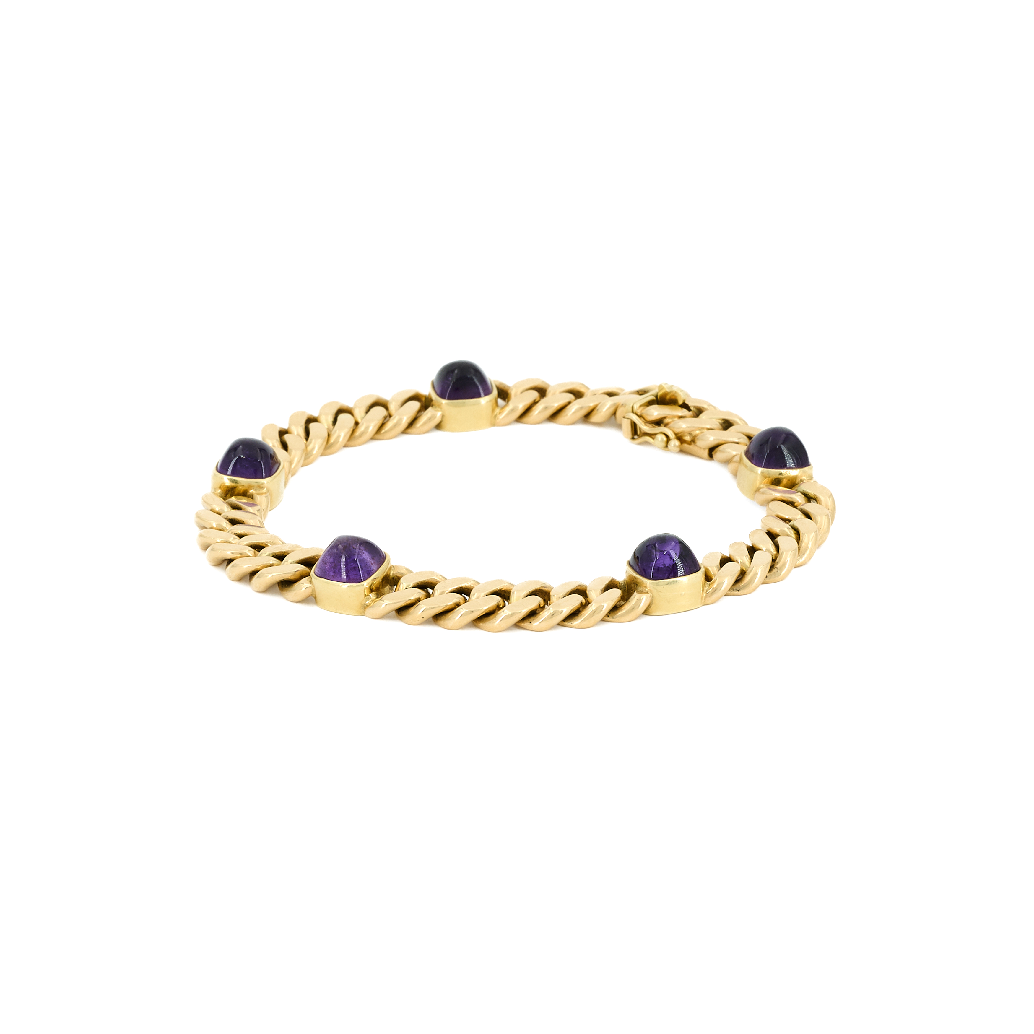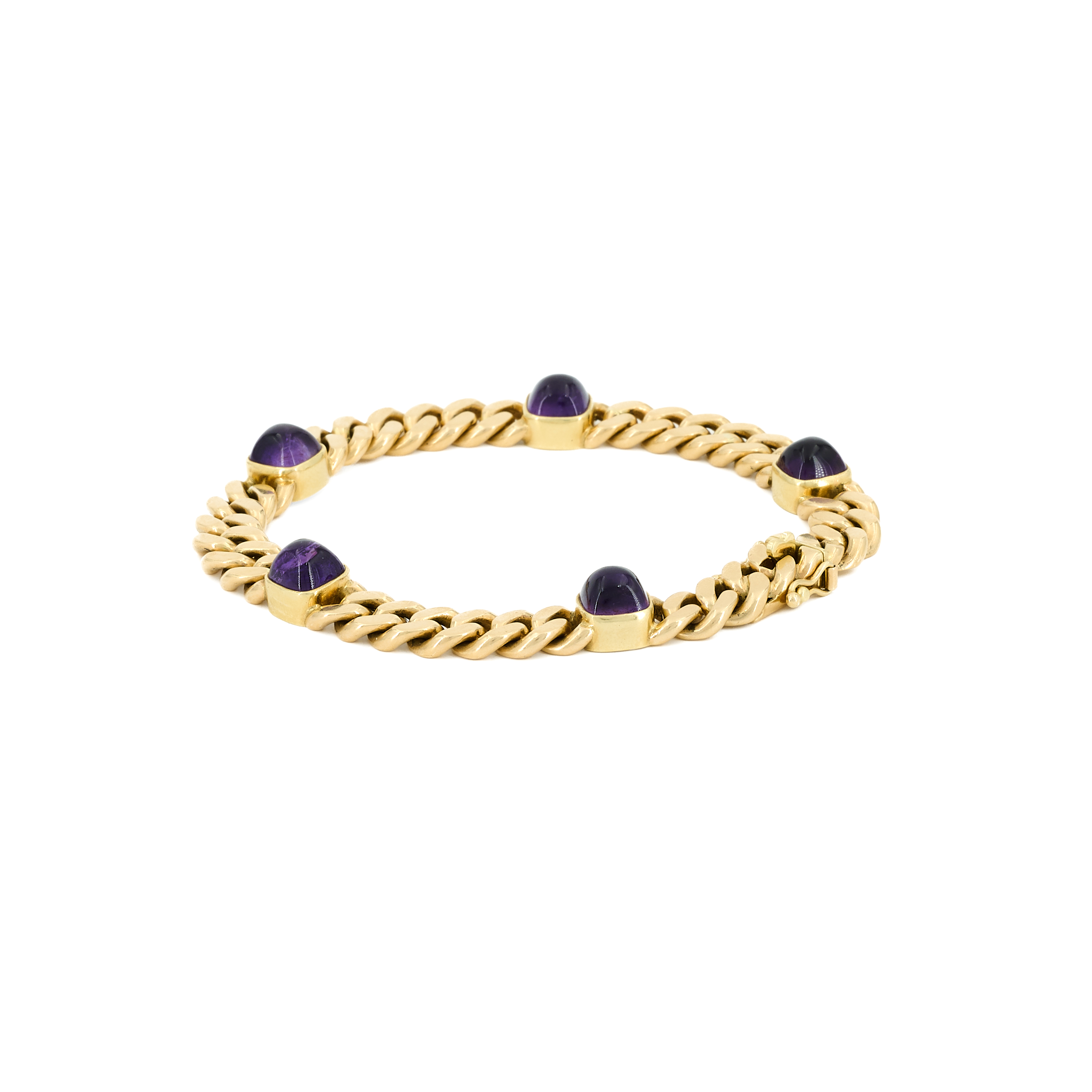 Beschreibung: Klassisches Amethyst-Panzerarmband, besetzt mit Amethyst-Cabochons.