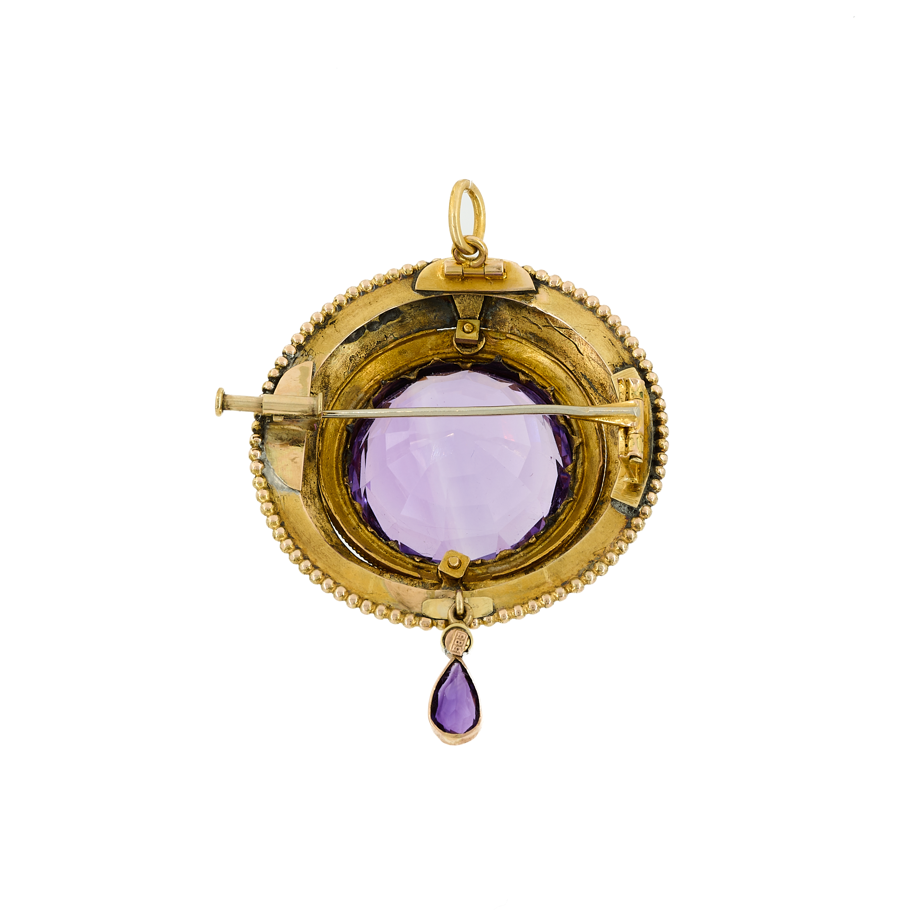 Beschreibung: Kleiner Amethyst-Saatperl-Anhänger wohl nachträglich, eine Anhägeröse und die Broschierung wohl später erneuert. Mariage.