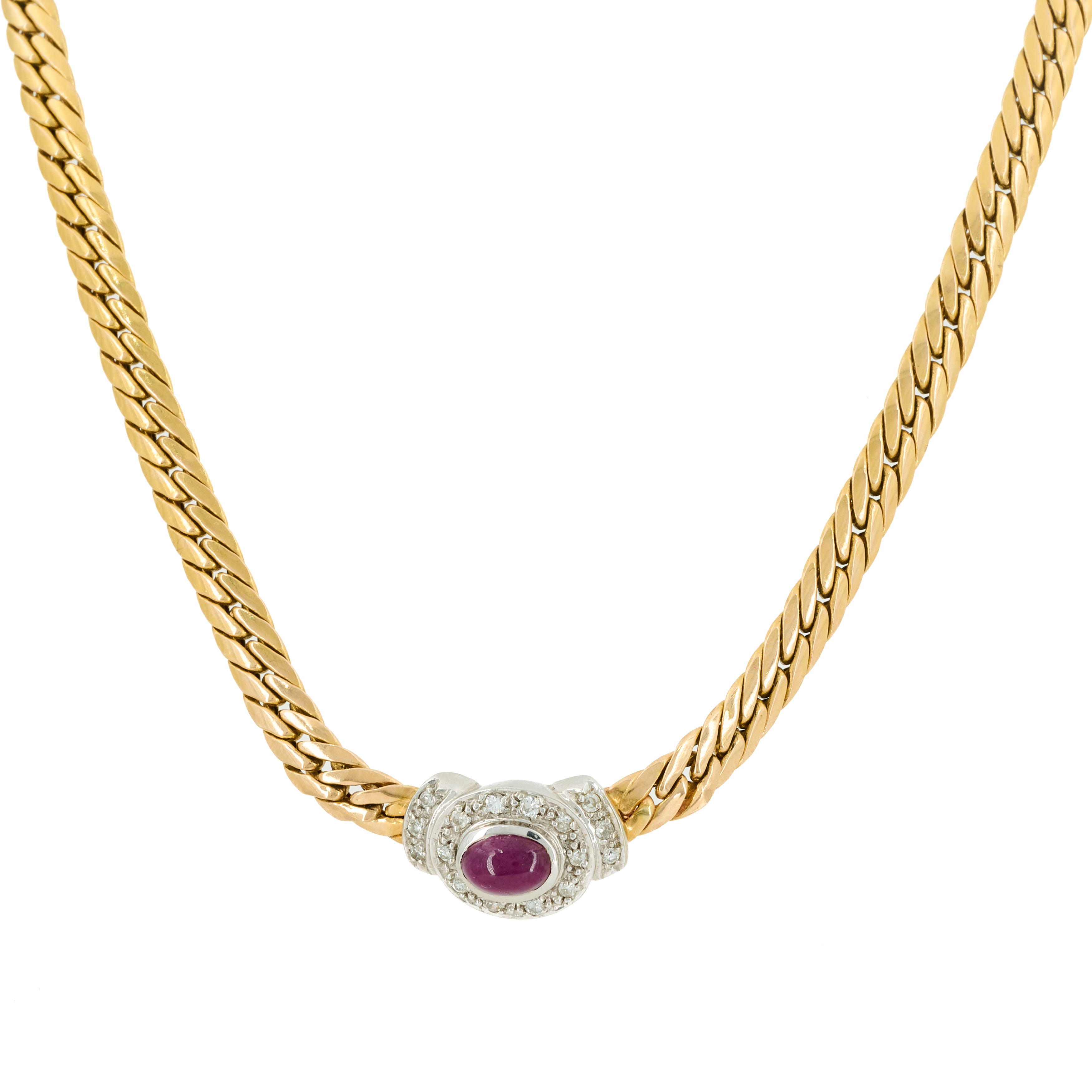 Rubin-Cabochon in Zargenfassung sowie Brillantbesatz trägt.
