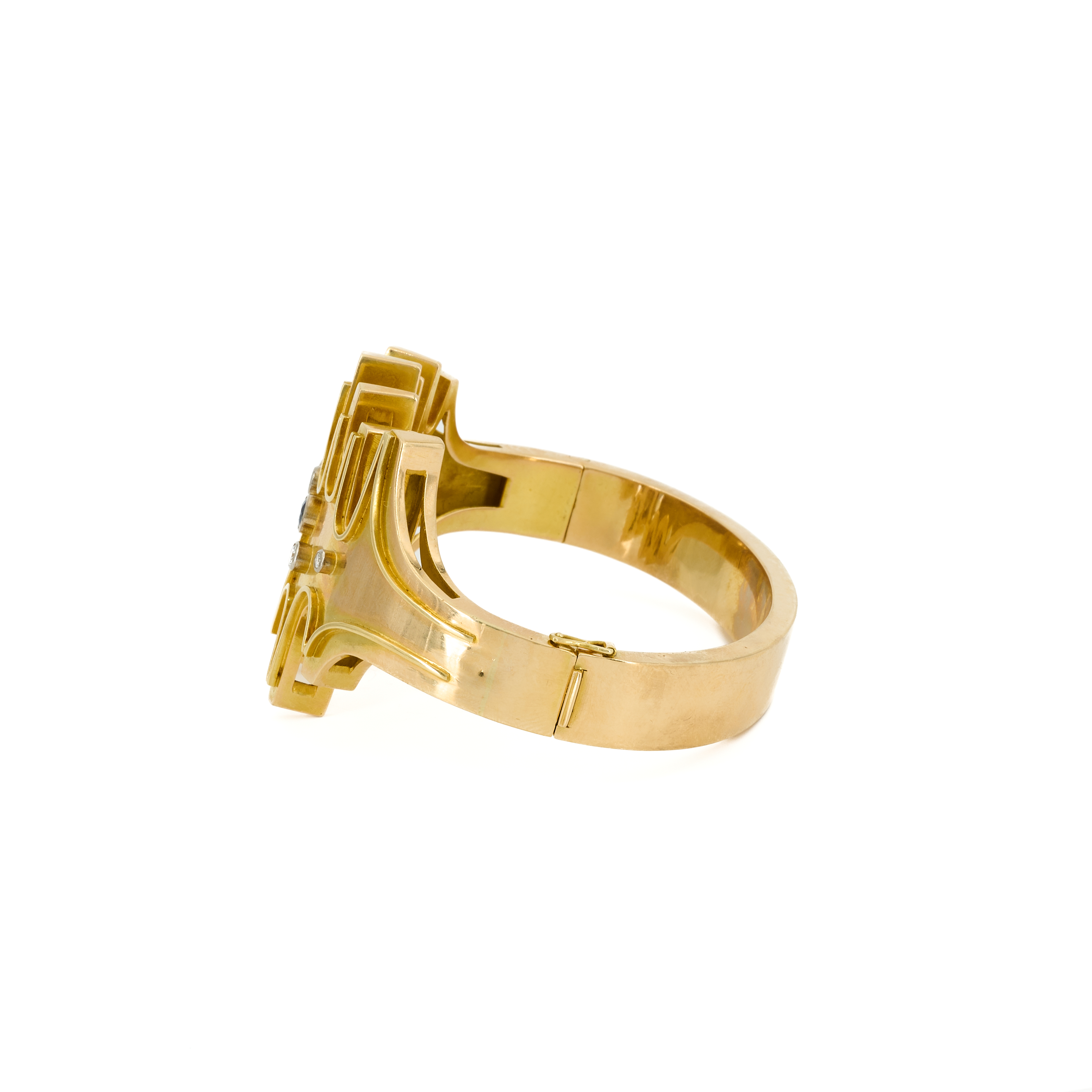 Beschreibung: Hohl gearbeiteter Roségold-Armreif mit Scharnier sowie Drahtauflage in Gelbgold, besetzt