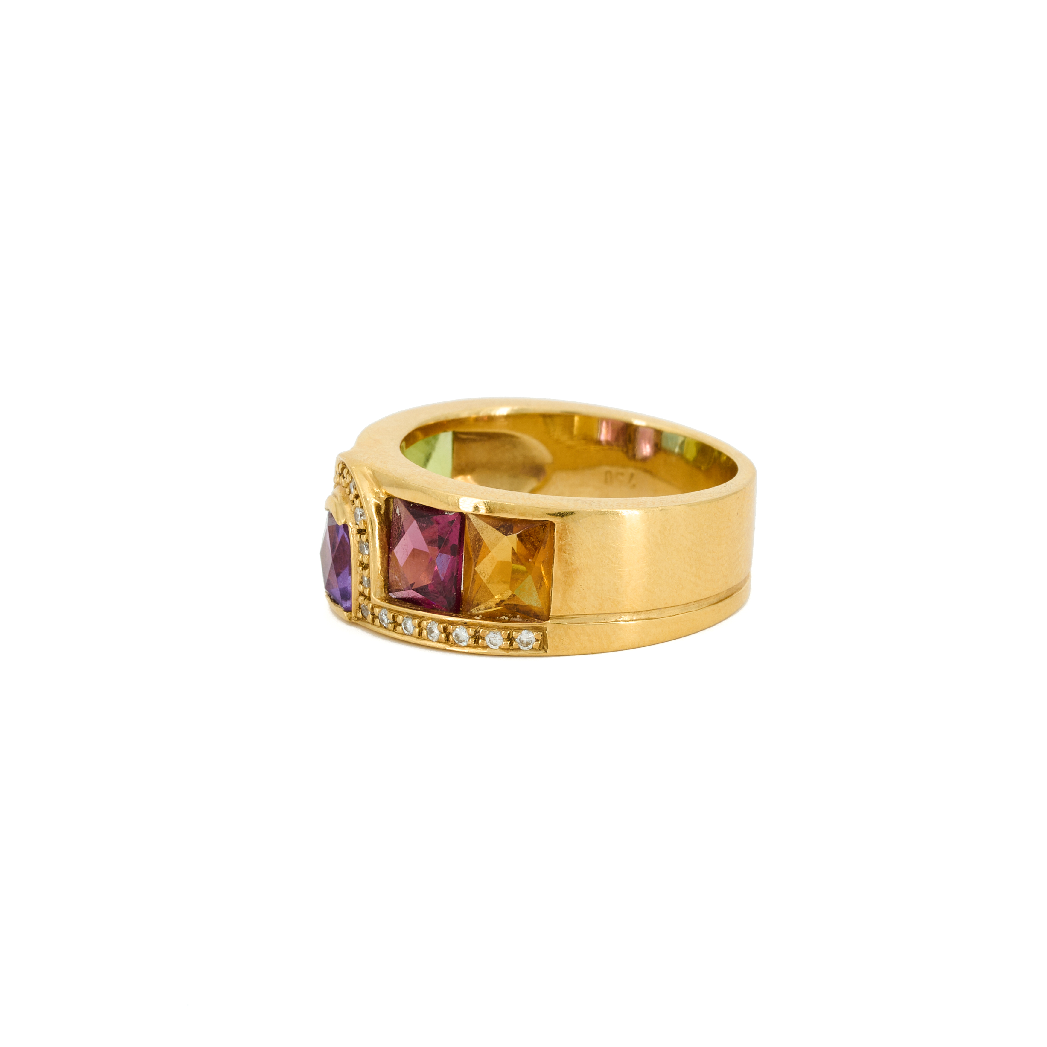 Beschreibung: Geometrisch gestalteter Gelbgoldring, besetzt mit fünf verschiedenfarbigen Farbsteinen im