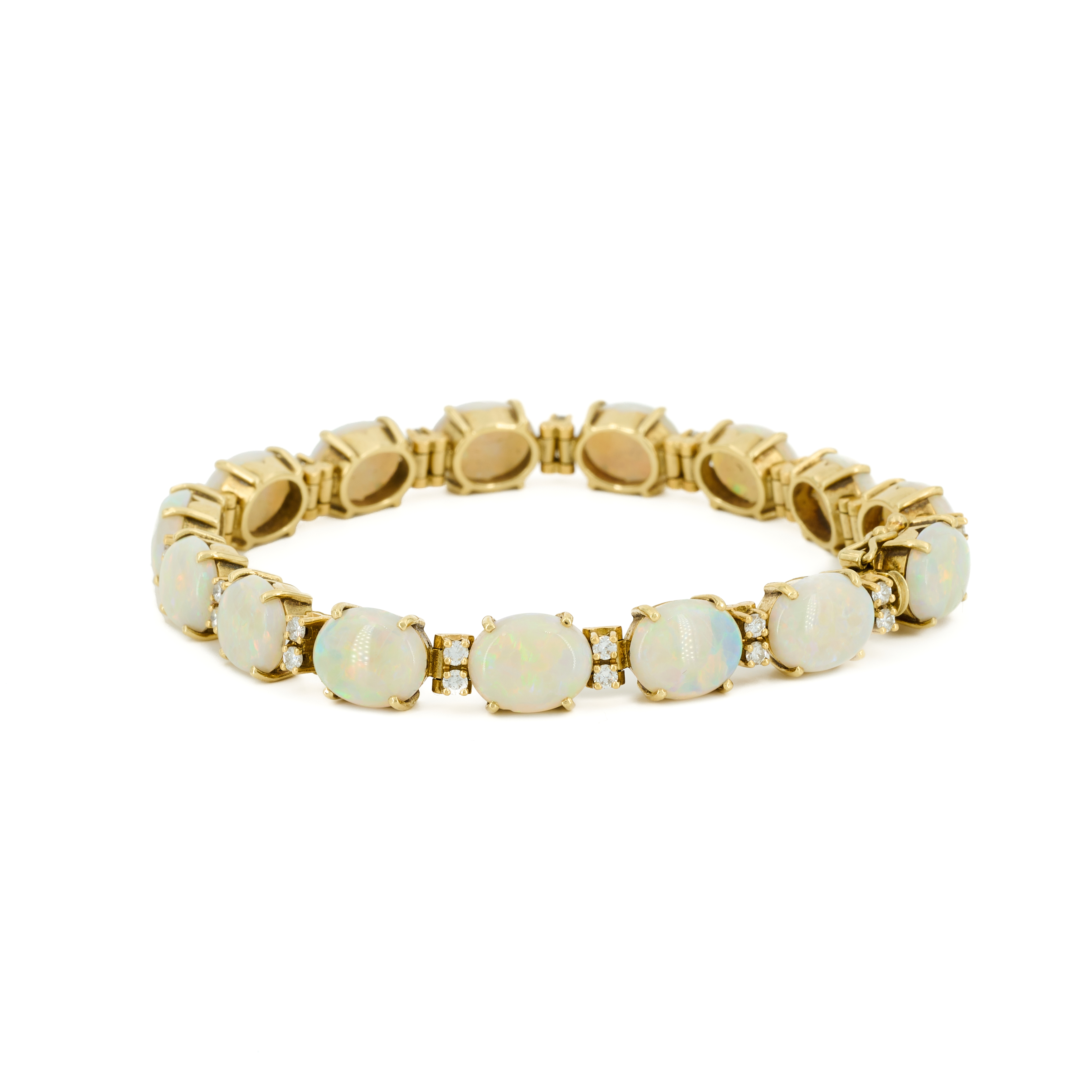 Beschreibung: Gelbgold-Armband mit Opal-Cabochons sowie Brillanten in Krappenfassungen besetzt. Durch