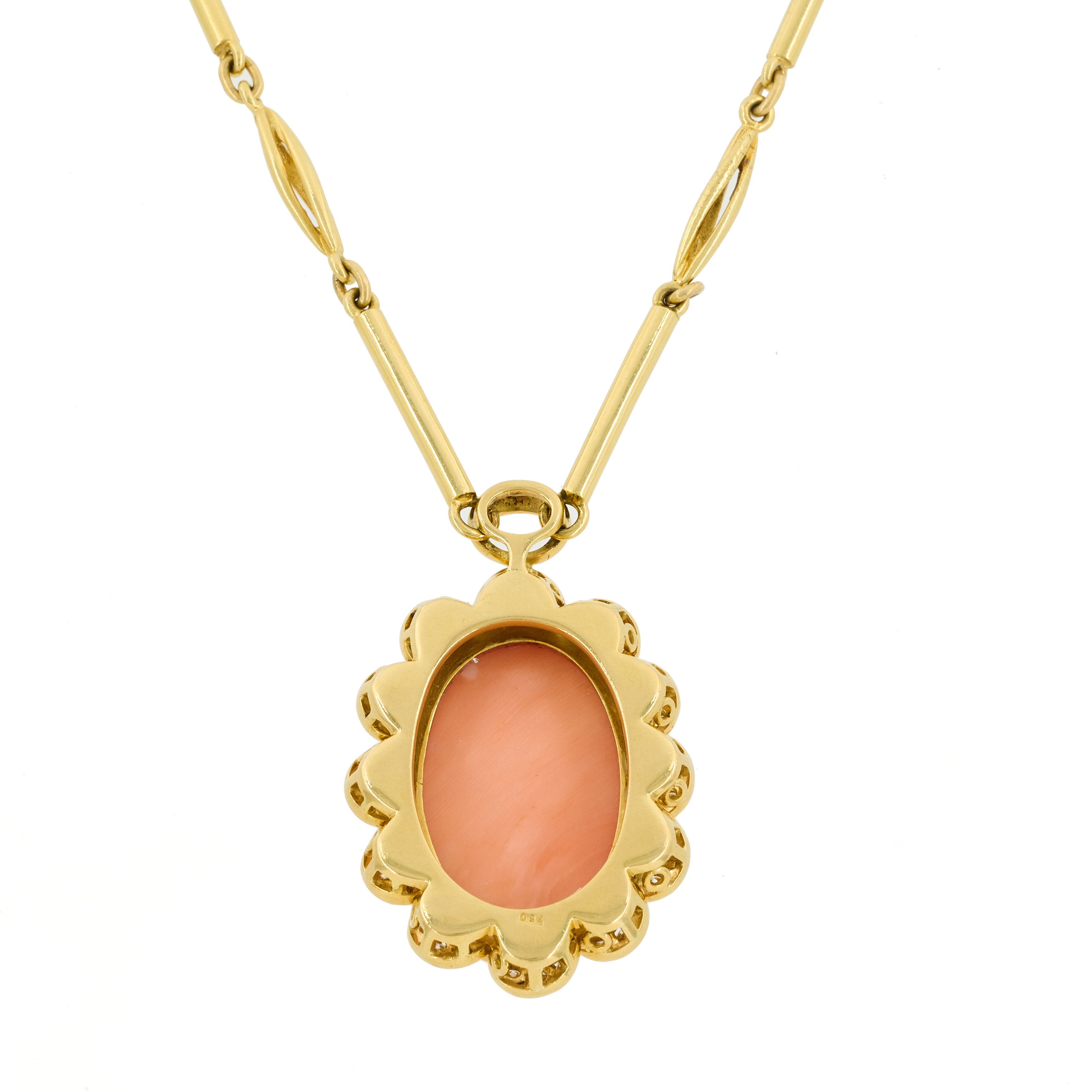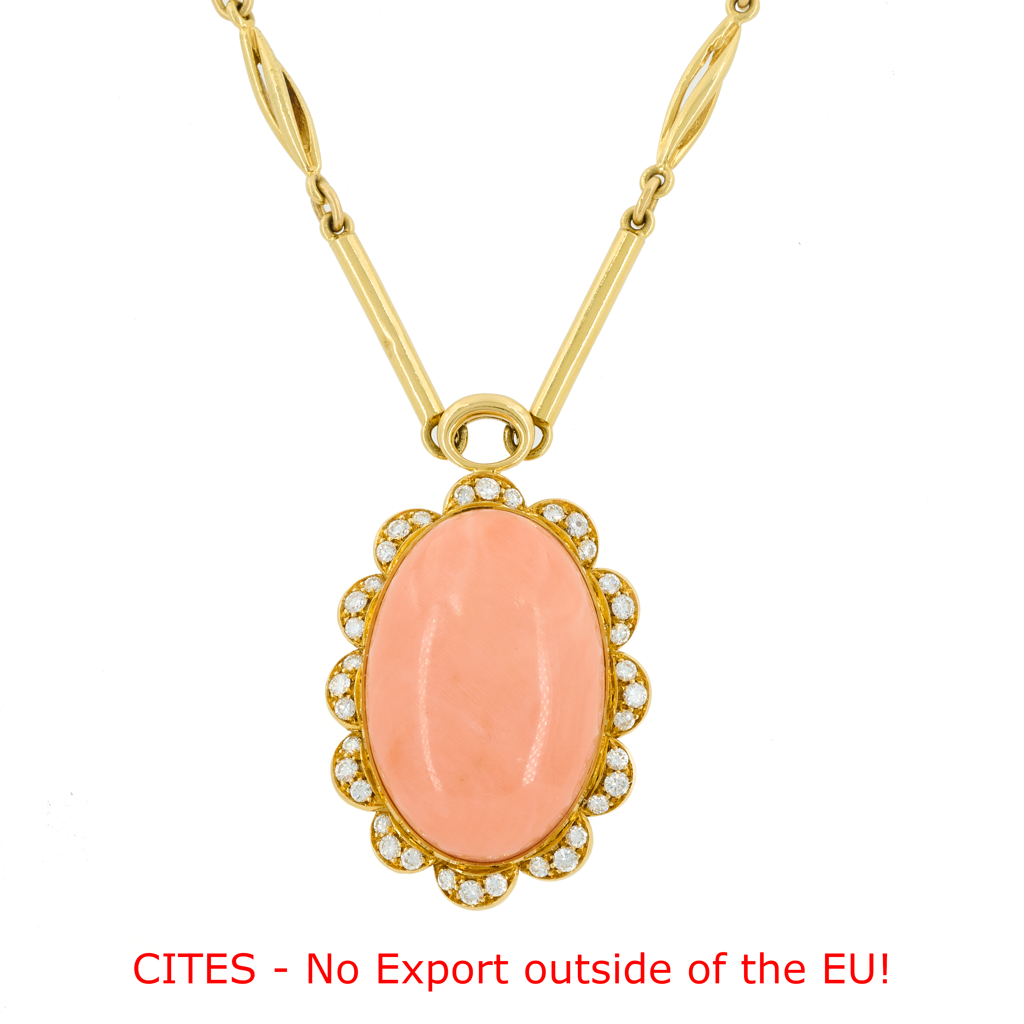 Beschreibung: Der florale Anhänger ist mit einem ovalen Korall-Cabochon in Zargenfassung versehen sowie umlaufend von Brillanten akzentuiert.