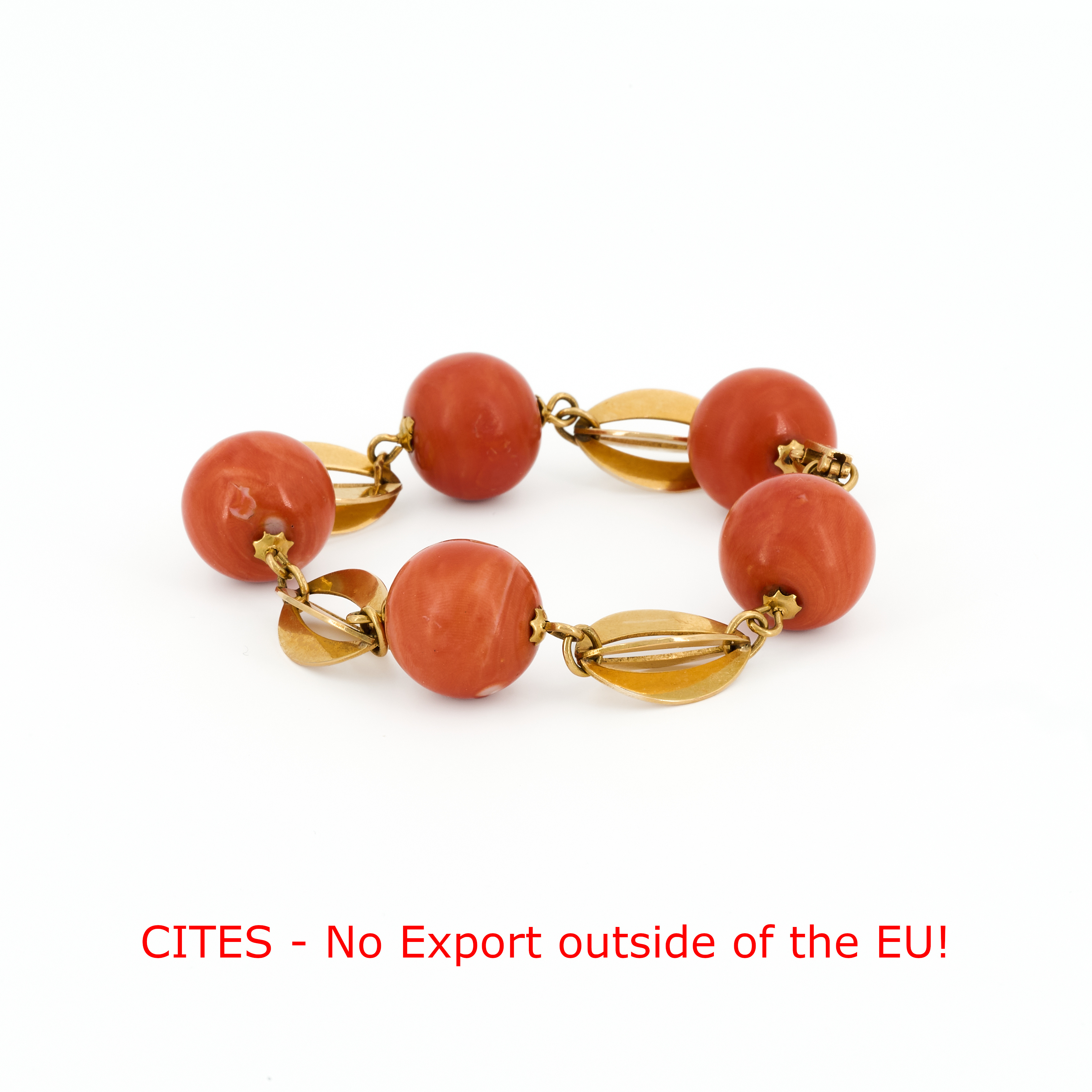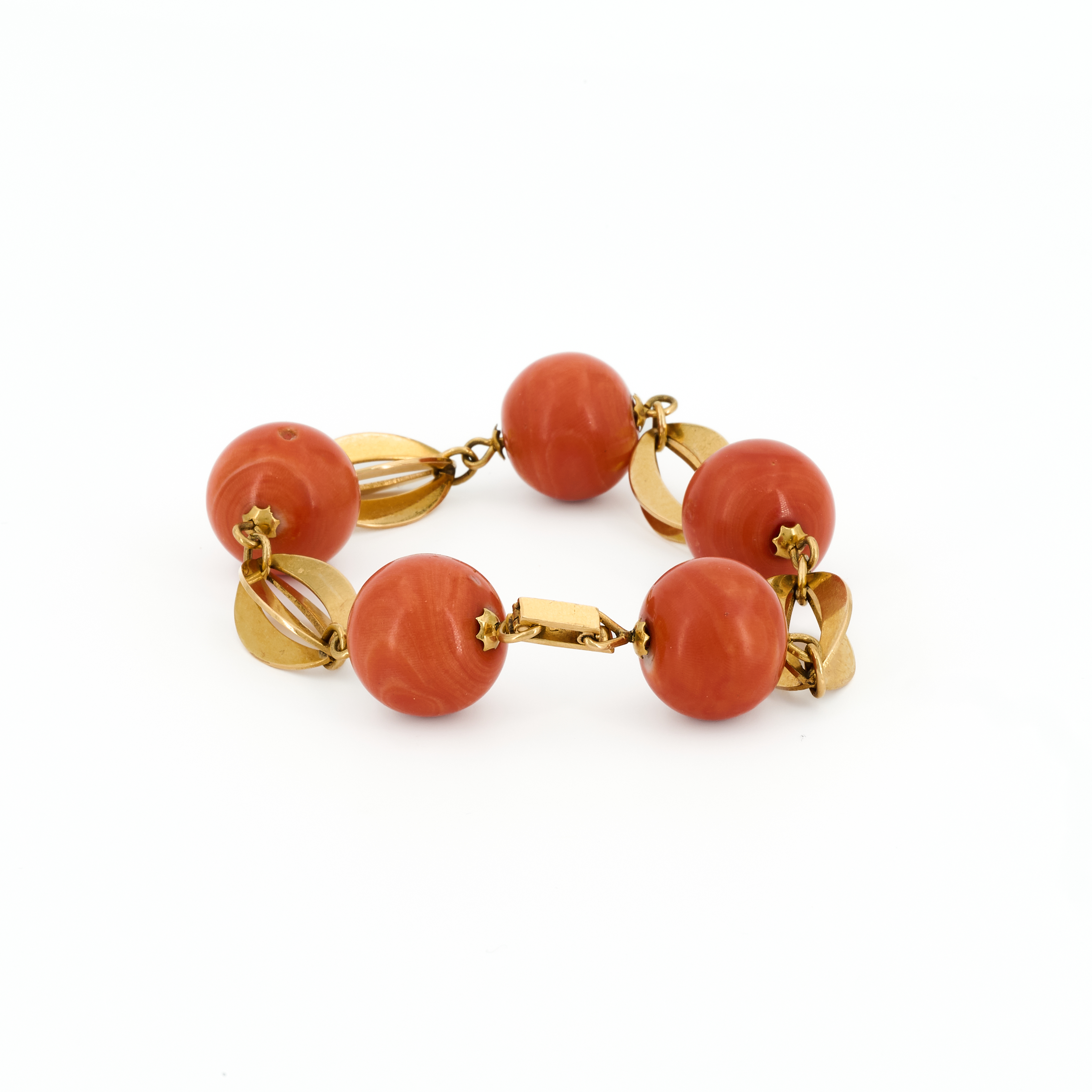 Beschreibung: Armband aus 5 Korallkugeln im Wechsel mit 4 navetteförmigen Gelbgold-Elementen angeordnet.