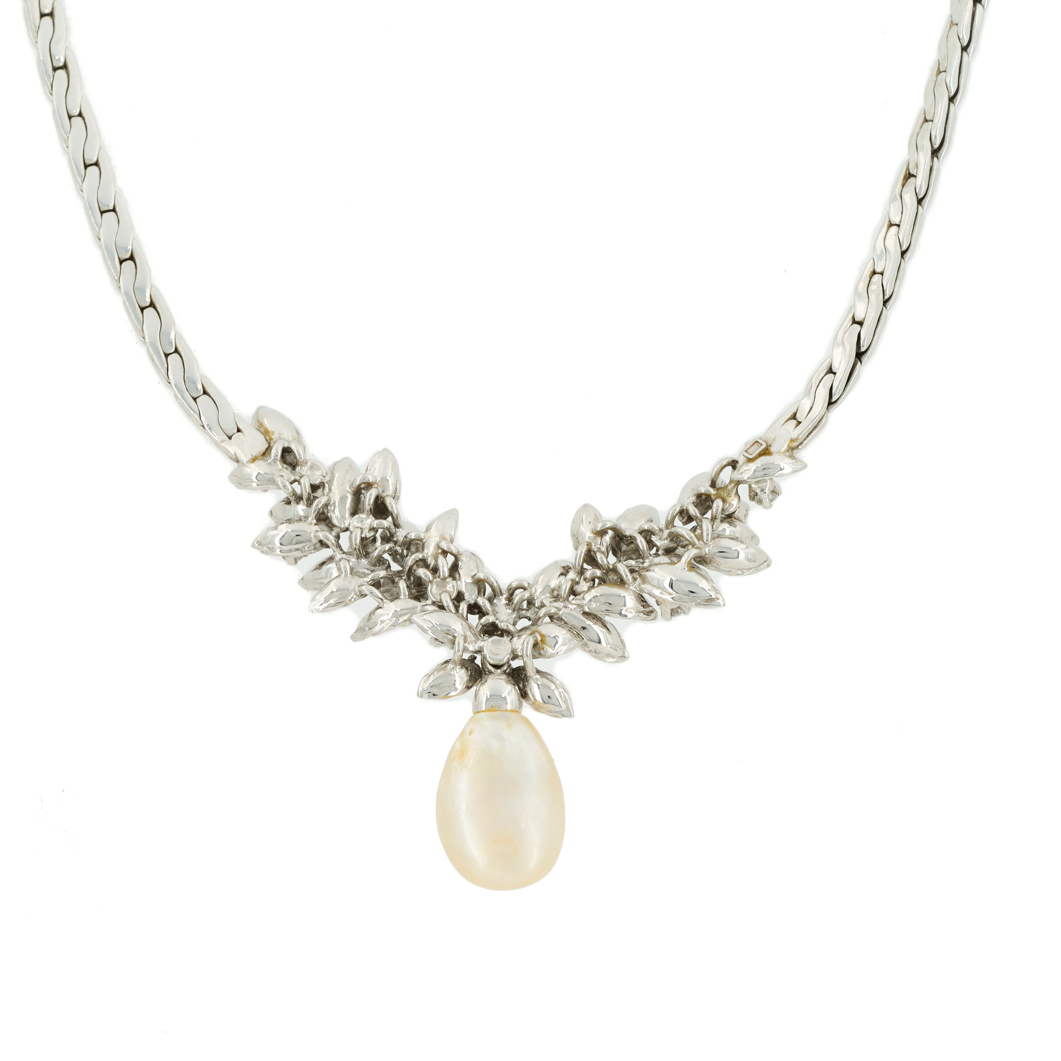 Blütenform, besetzt mit Diamanten und einer pendelnden Perle.