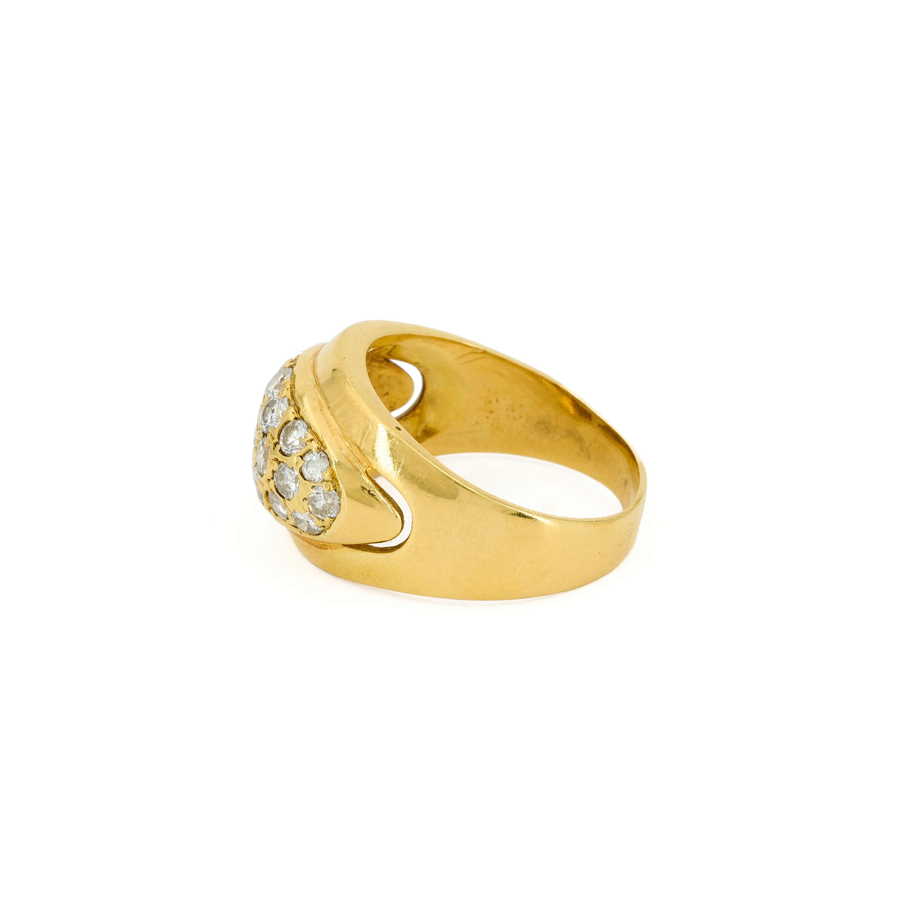 Beschreibung: Hohl gearbeiteter Gelbgoldring mit geordnetem Pavé aus 21 unterschiedlich großen Diamanten