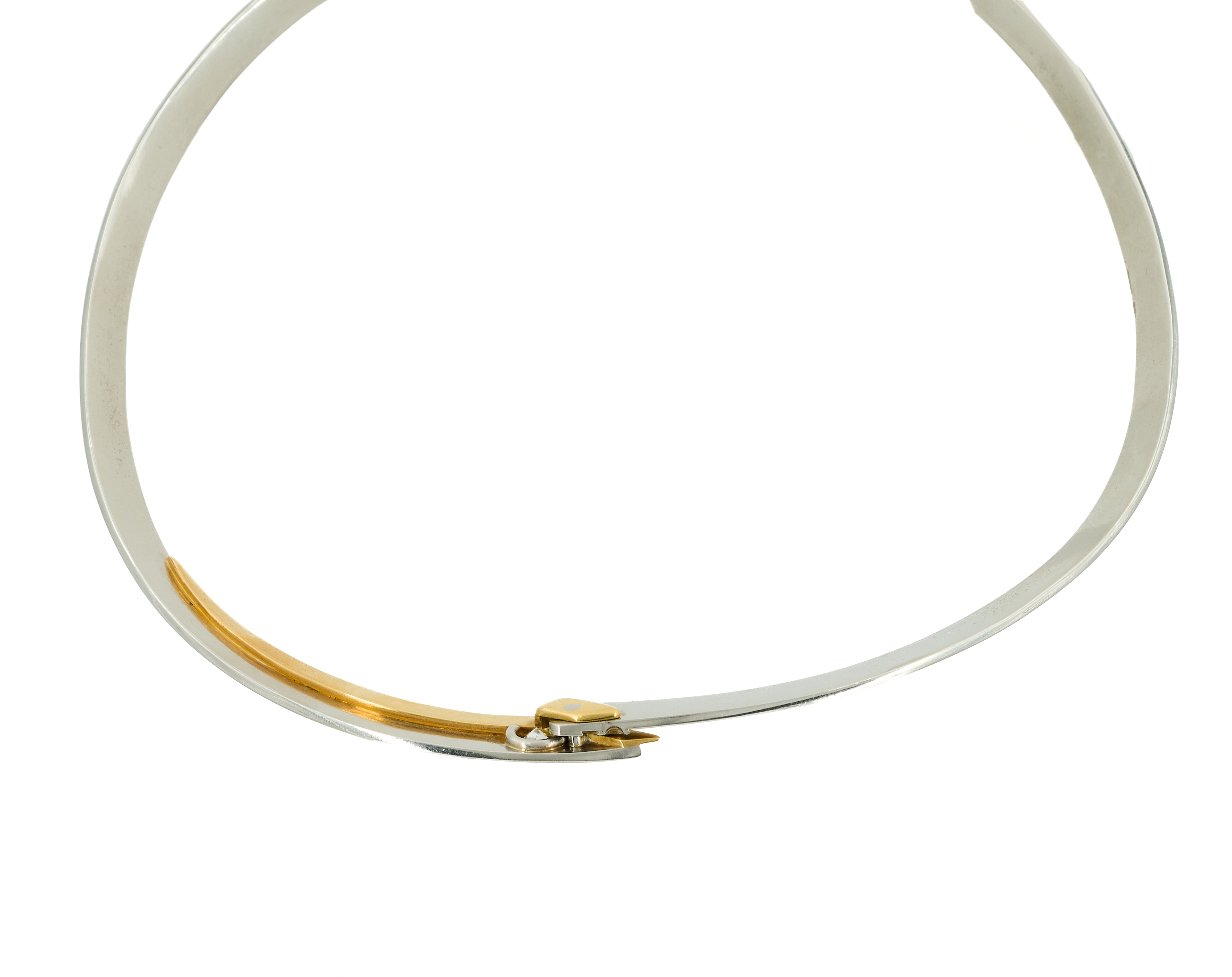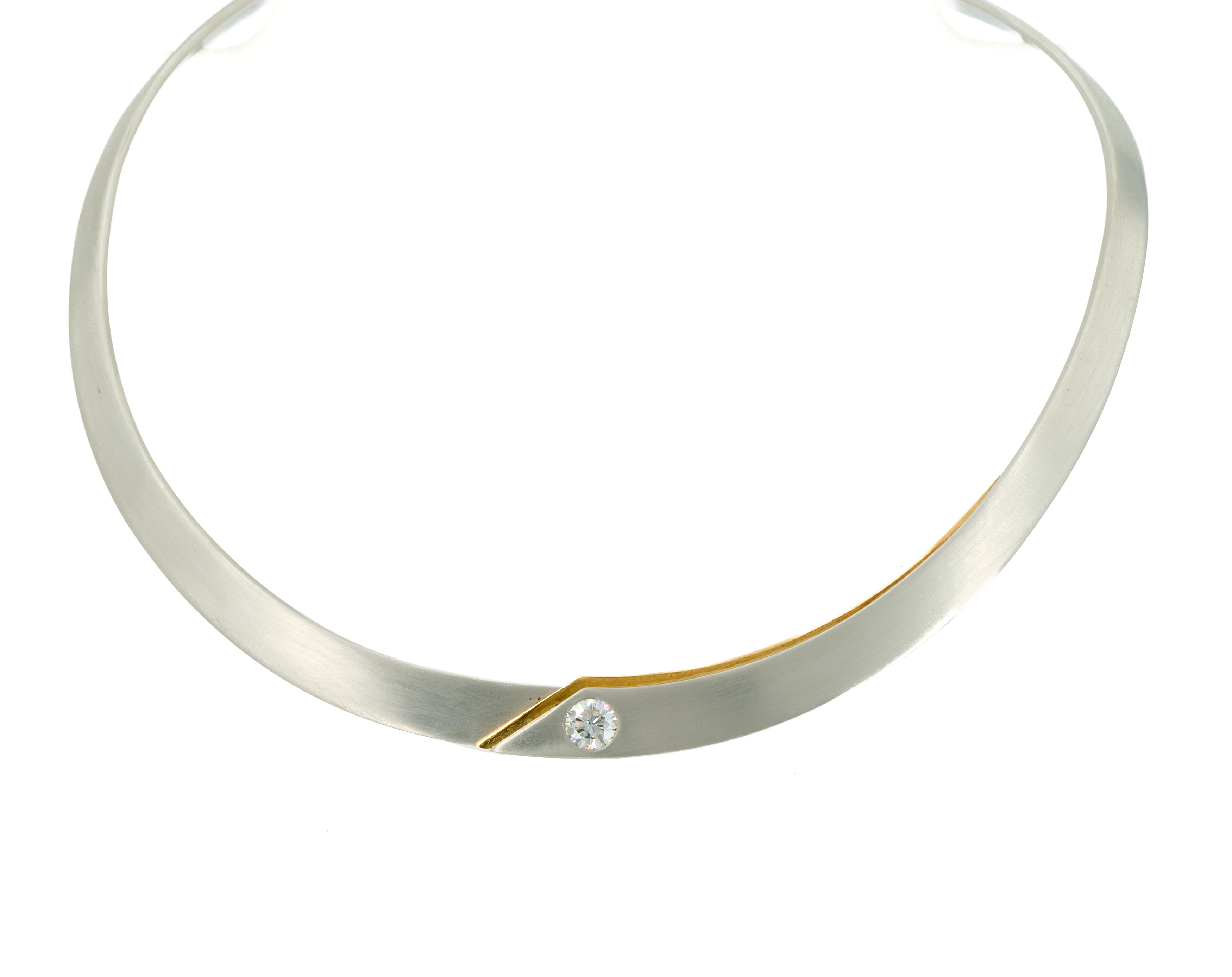Beschreibung: Seidenmatter Platin-Halsreif mit poliertem Gelbgold-Akzent und eingeriebenem Brillant.