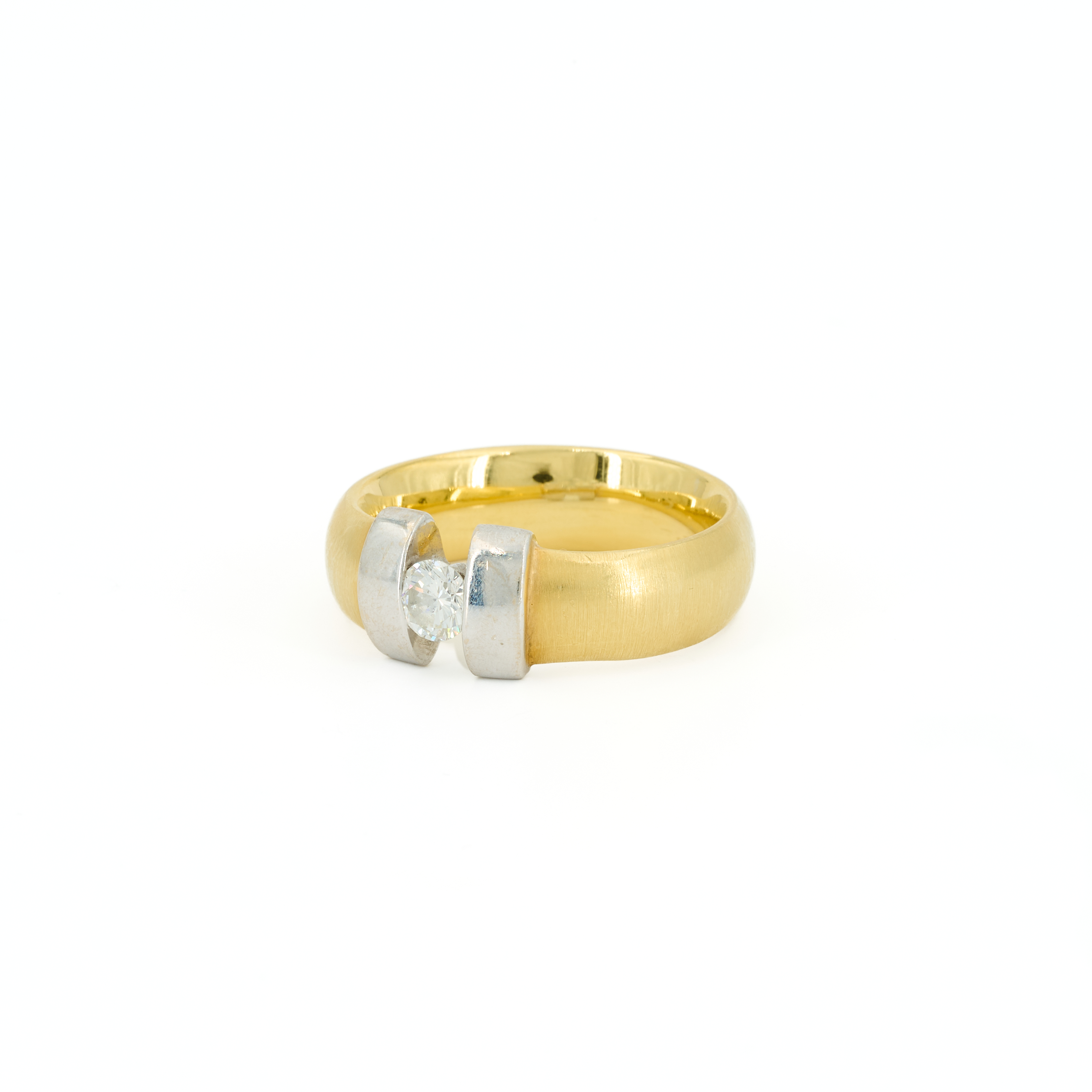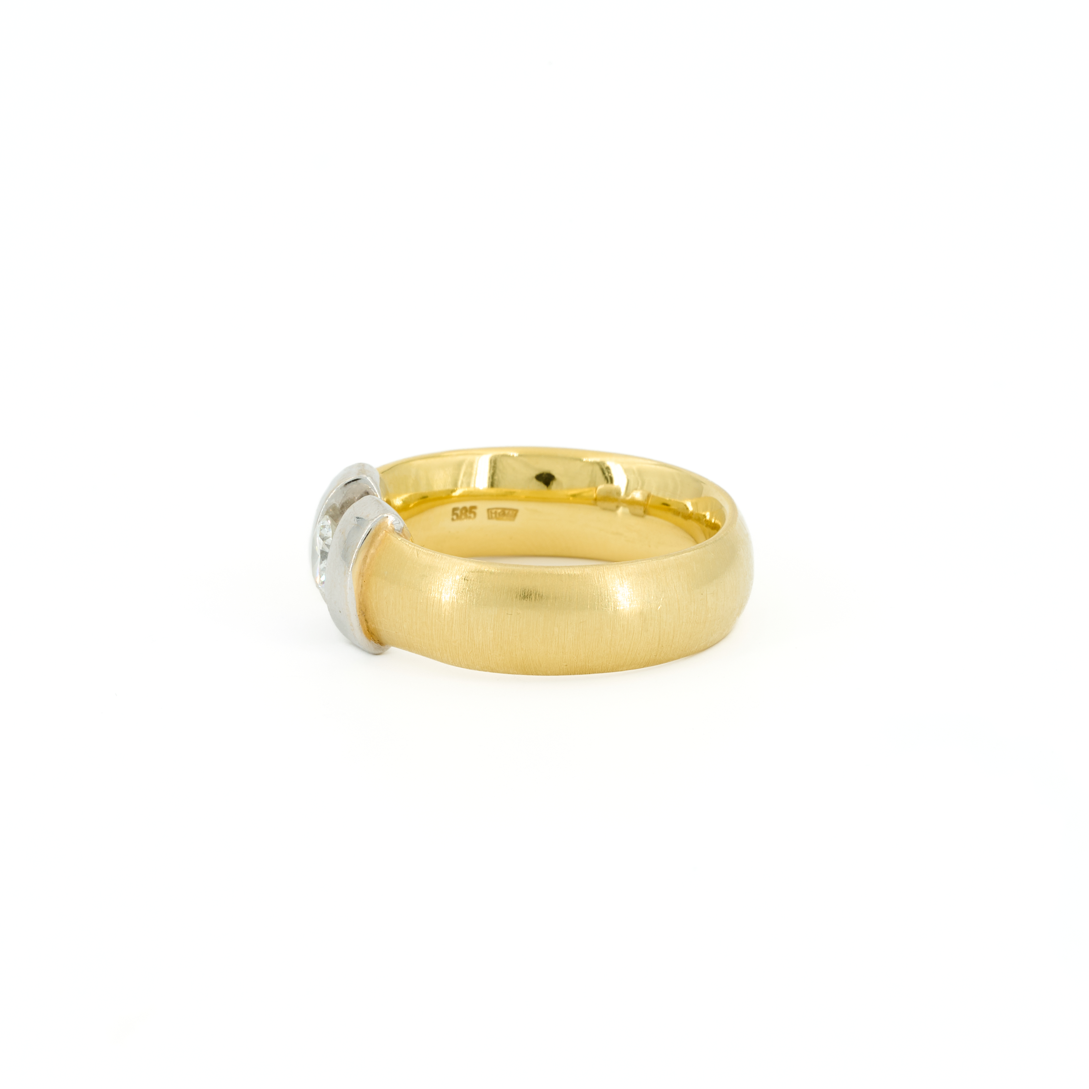 Beschreibung: Breiter Gelbgold-Spannring mit weißgoldener Fassung. Juwelierpunze "HGB".