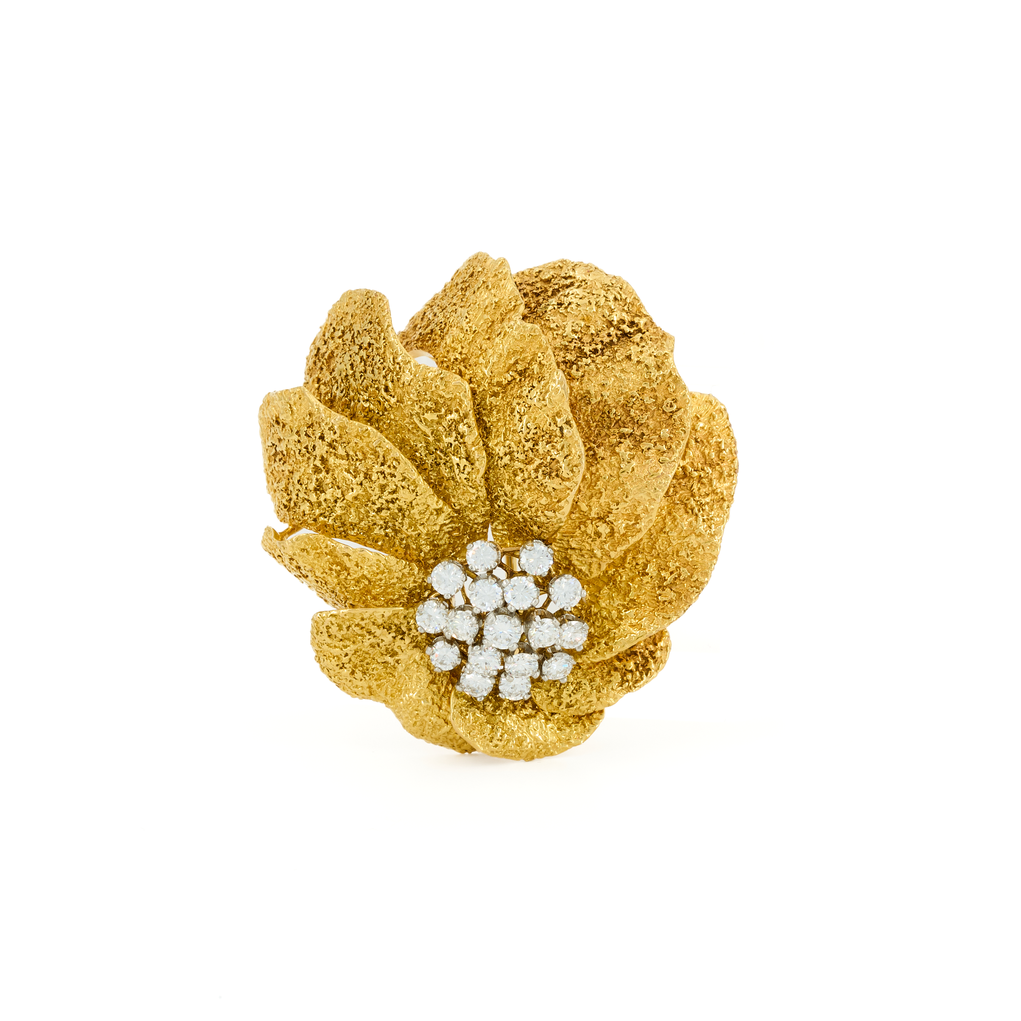 Beschreibung: Brosche aus Gelbgold in Form einer Blüte. Die neun Blütenblätter haben eine fein