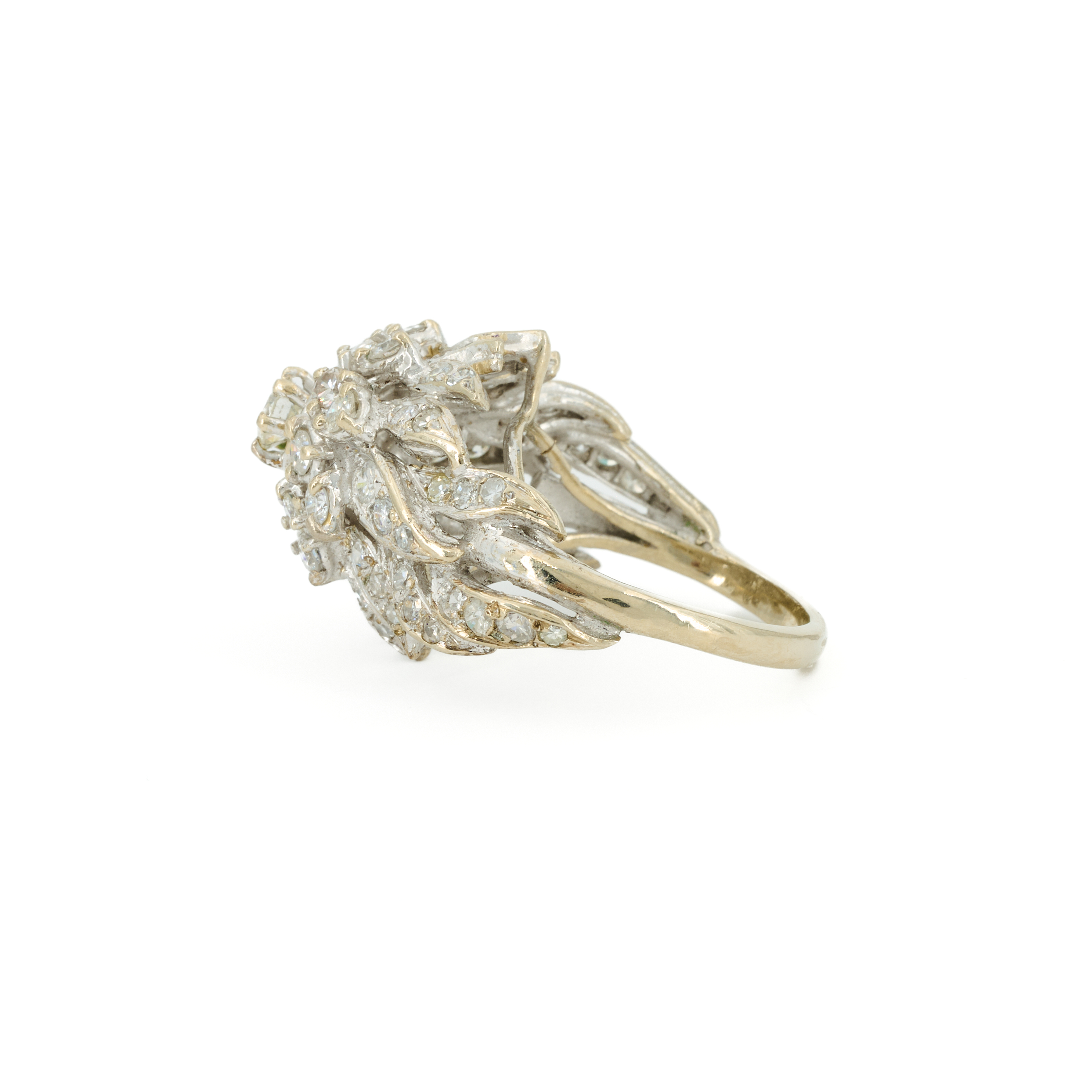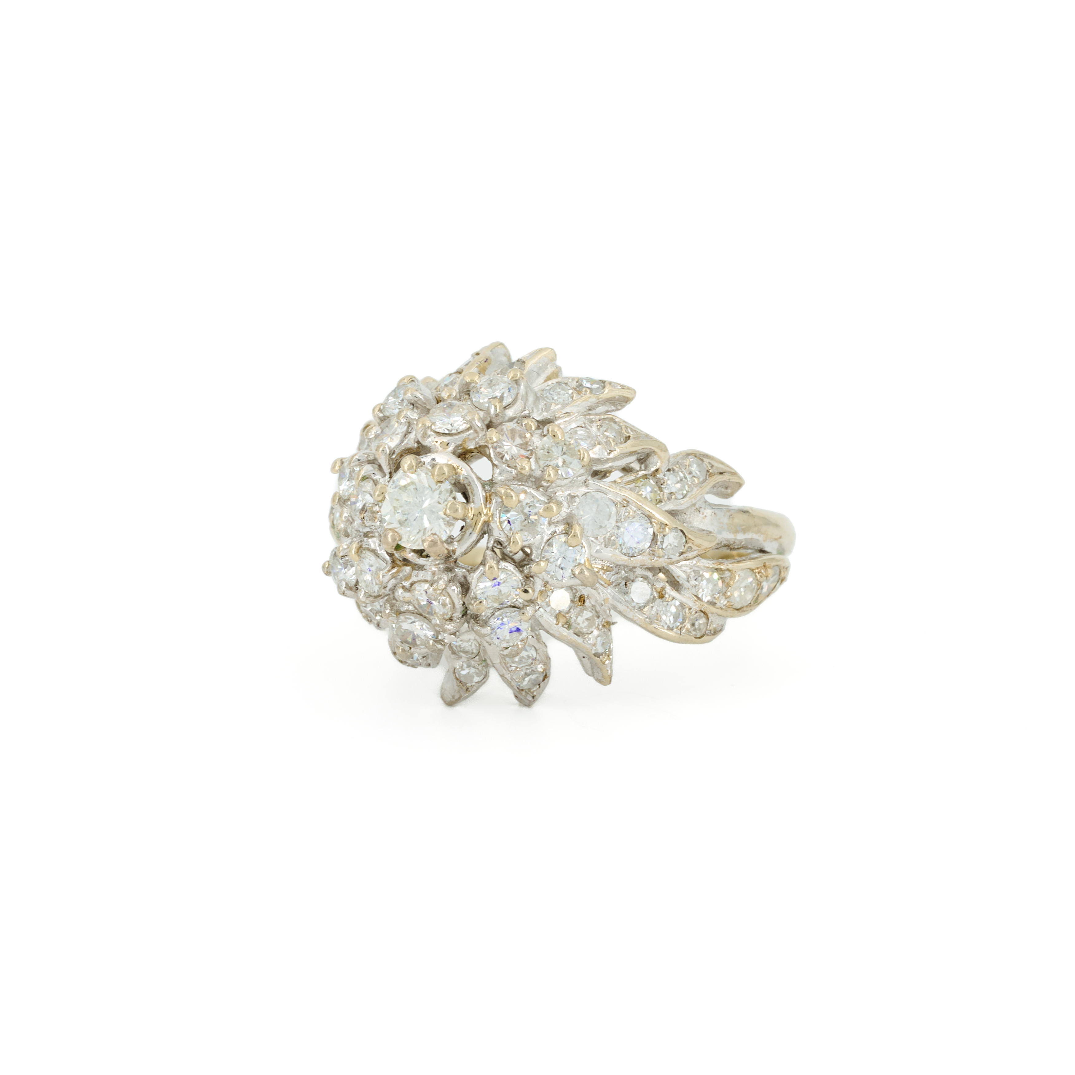 Beschreibung: Oppulenter Diamant-Ring aus Weißgold. Die Anordnung der Diamanten ist einer Blüte