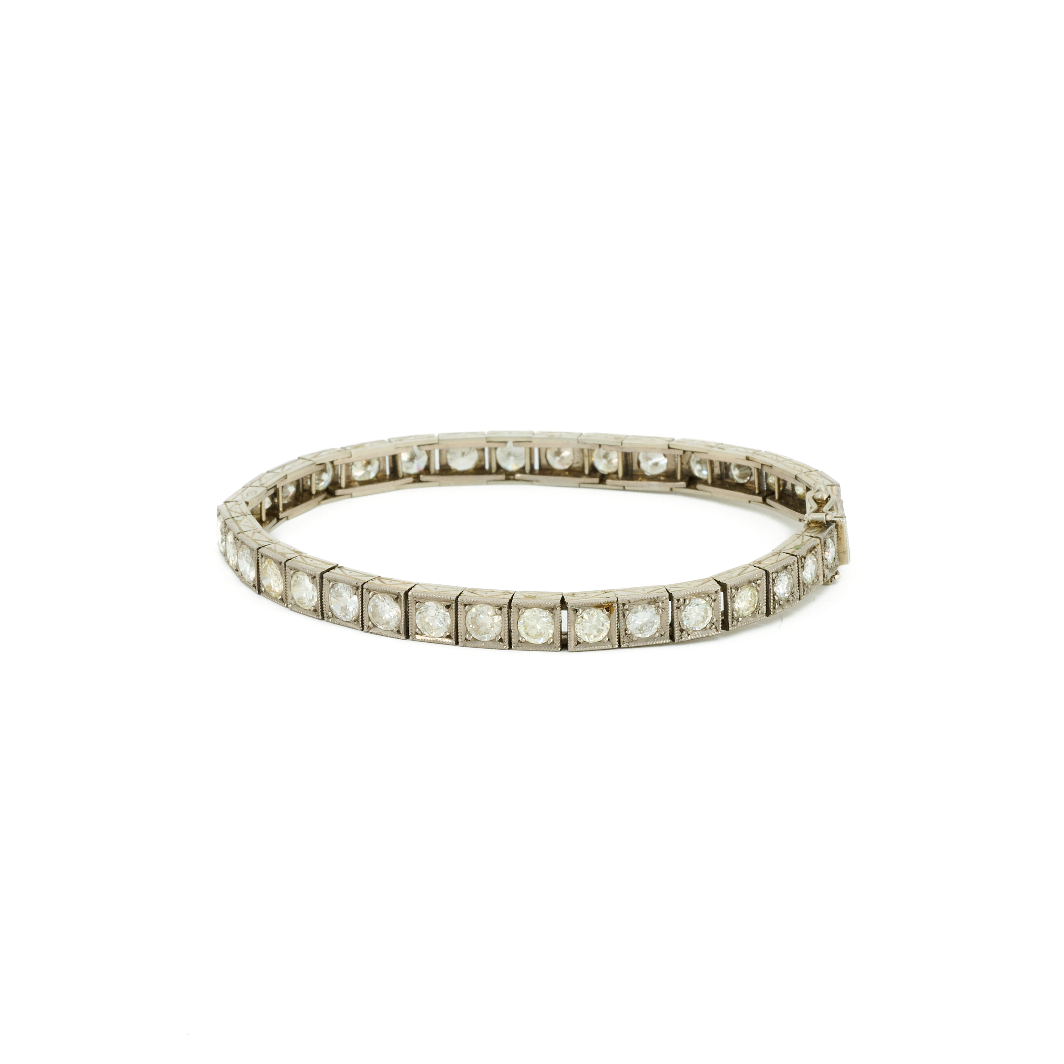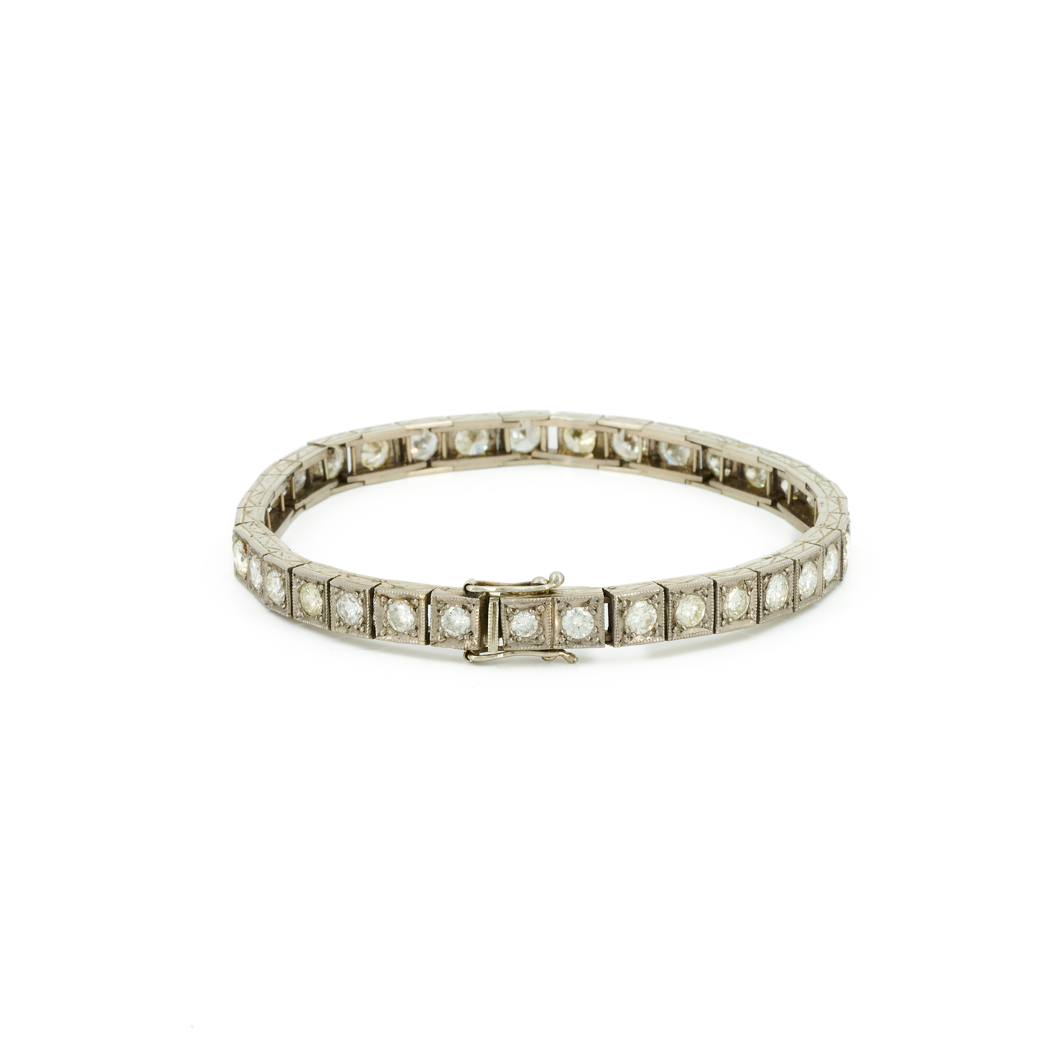 Beschreibung: Elegantes Tennis-Armband aus Weißgold, besetzt mit Brillanten in Karrée-Fassungen, feinem