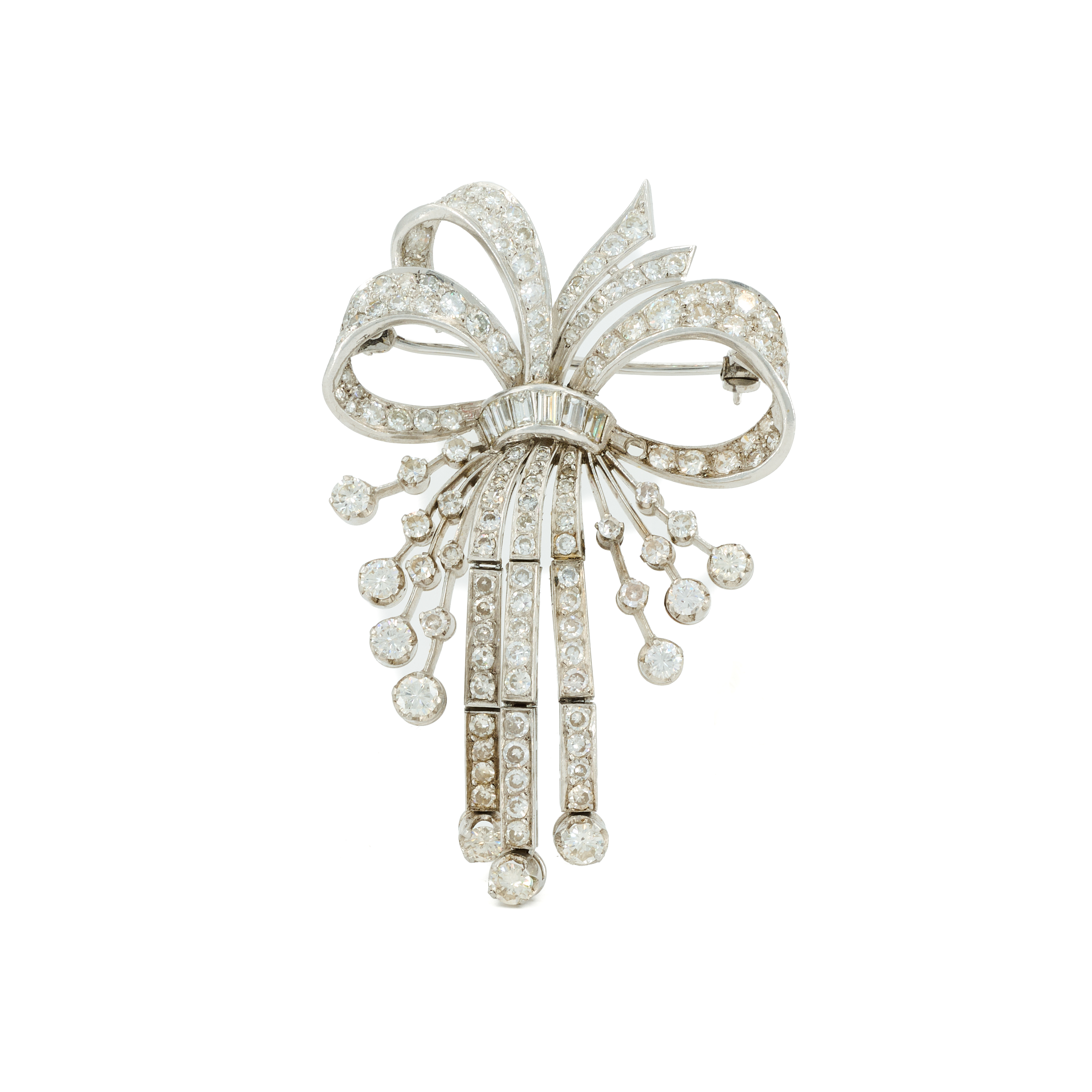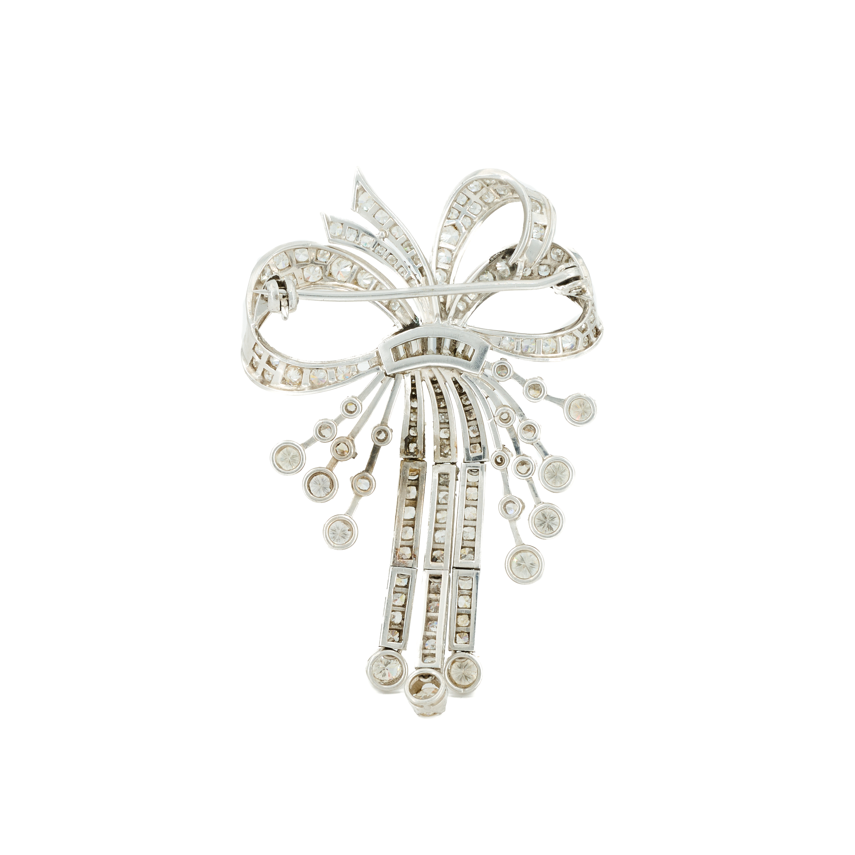 Beschreibung: Elegante Brosche aus Platin, gestaltet als Schleife, vollständig mit Diamanten besetzt.