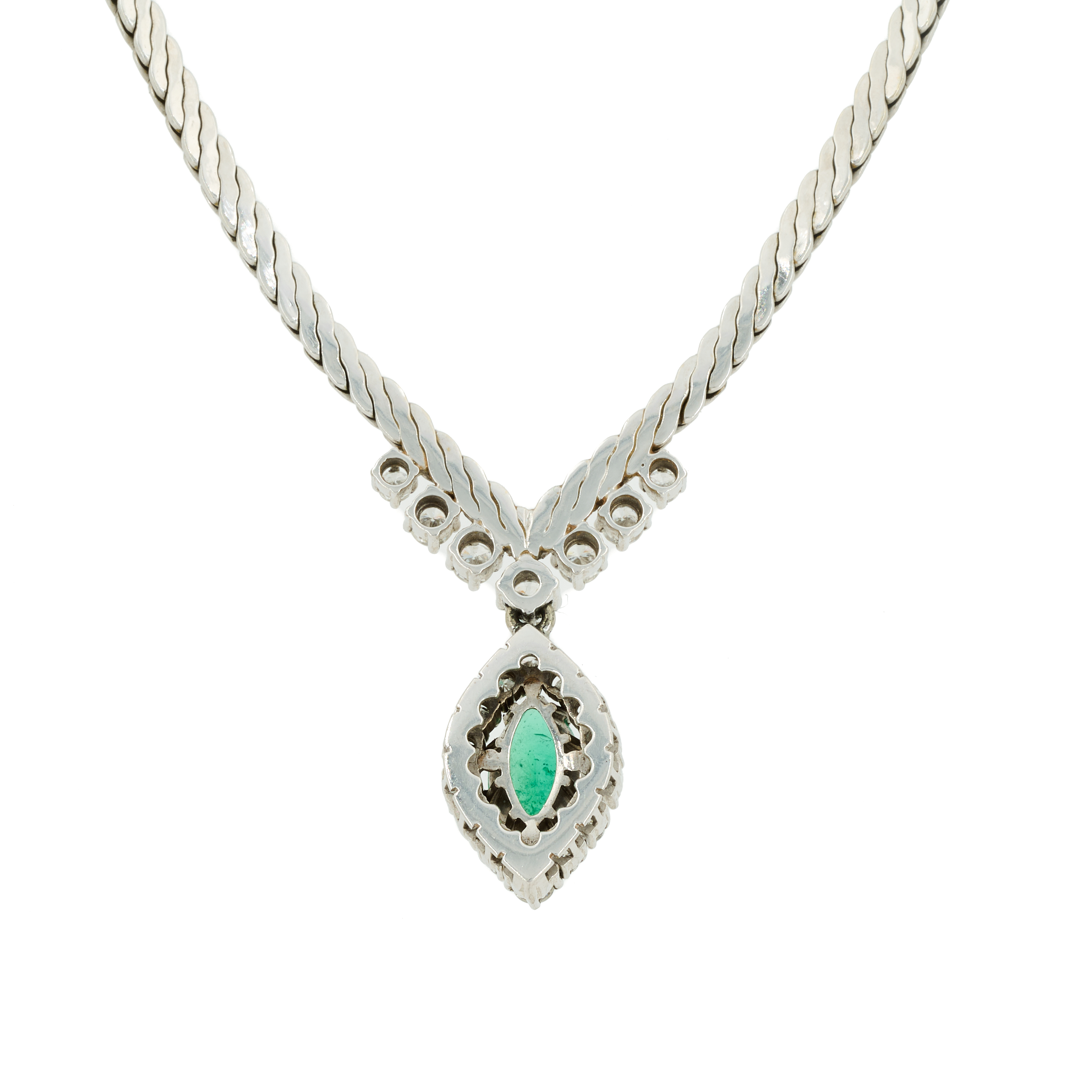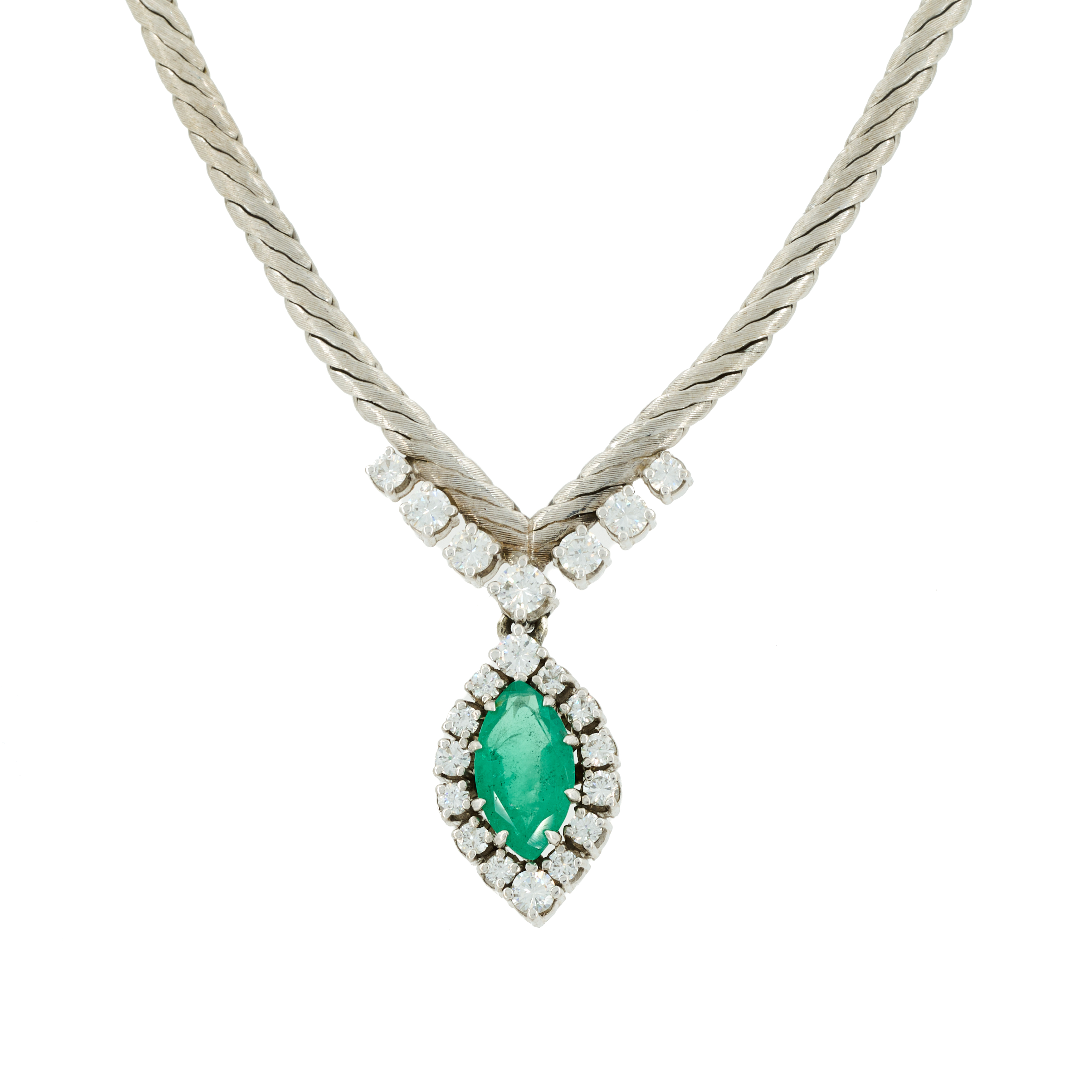 Beschreibung: Weißgold-Collier aus einer Kette mit satinierter Oberfläche, die V-förmig zusammenläuft, sowie einem Mittelteil, das mit einem Smaragd im Marquiseschliff besetzt ist, umrahmt von Brillanten.