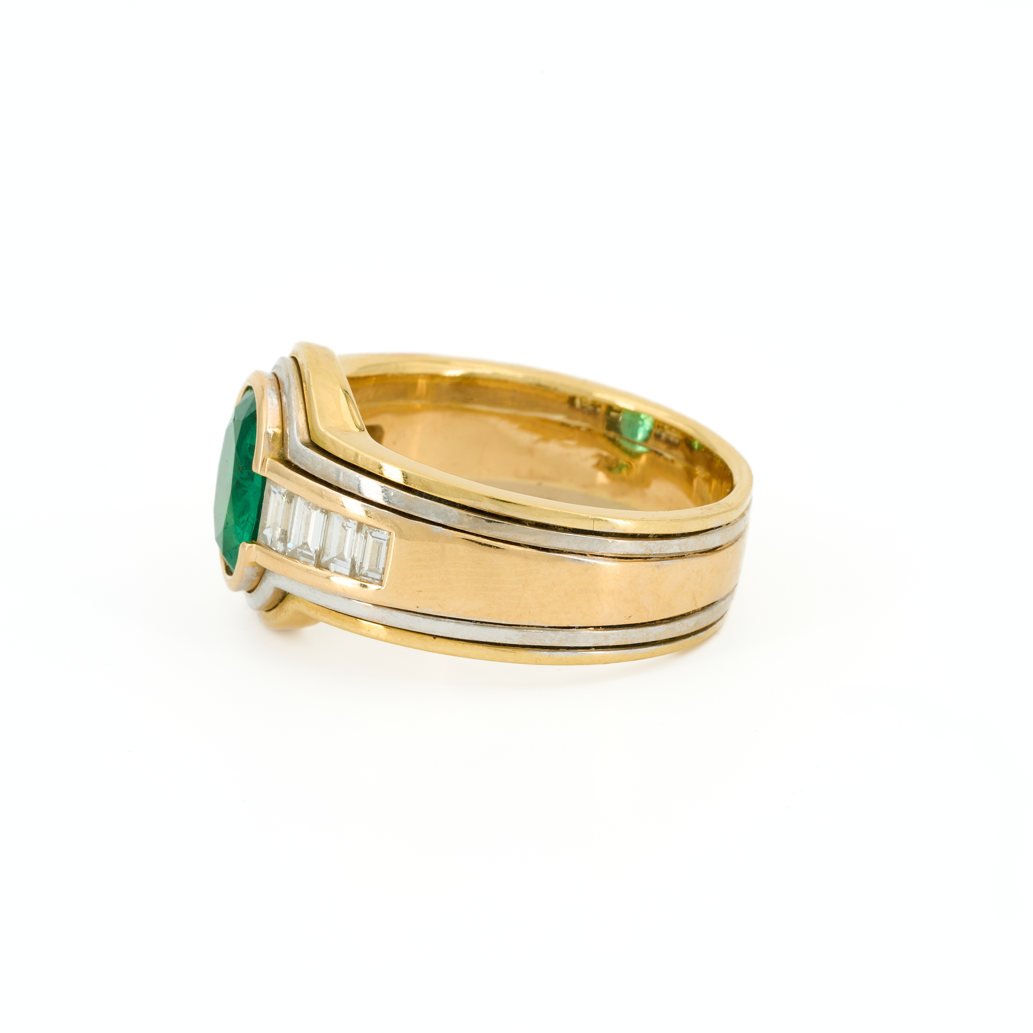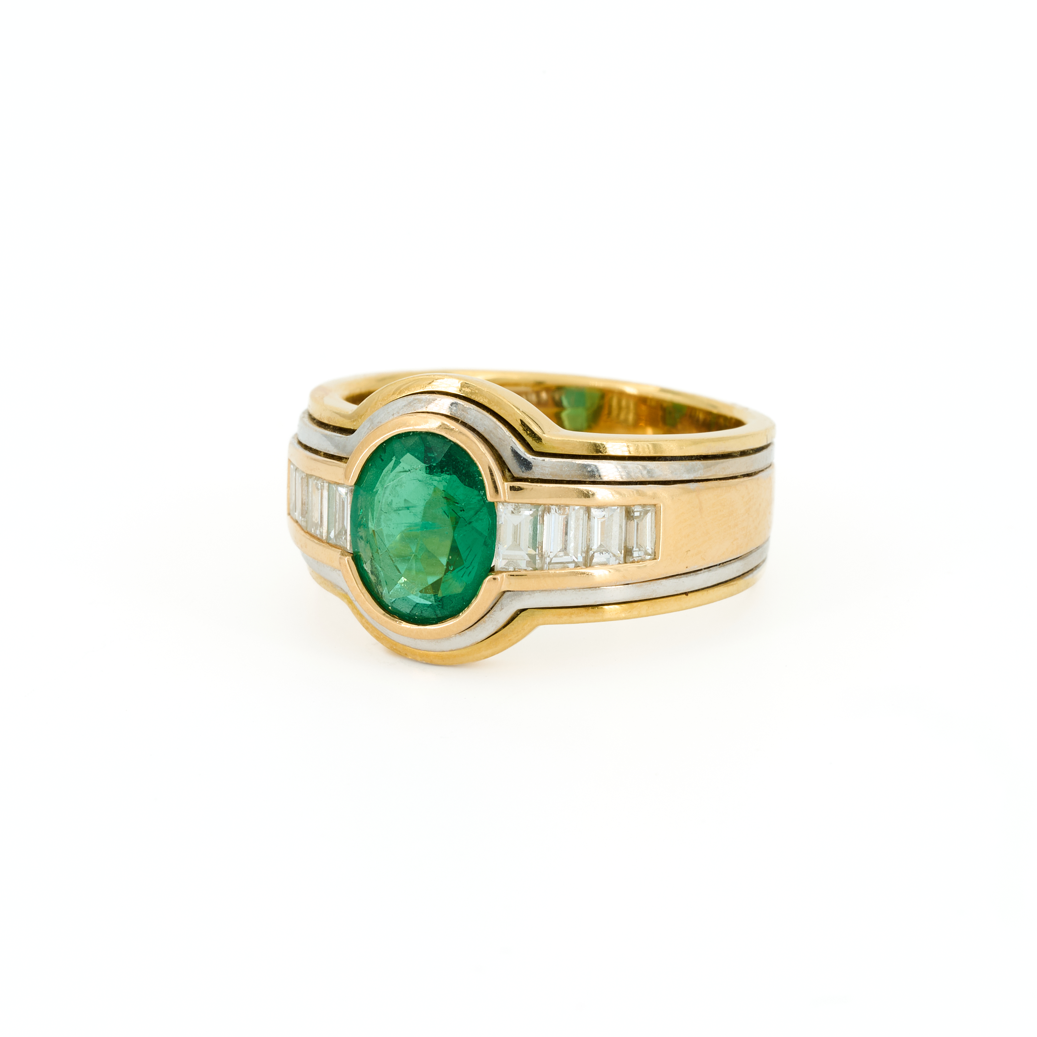 Beschreibung: Imposanter Bicolor-Ring mit ovalem Smaragd, der seitlich von jeweils vier