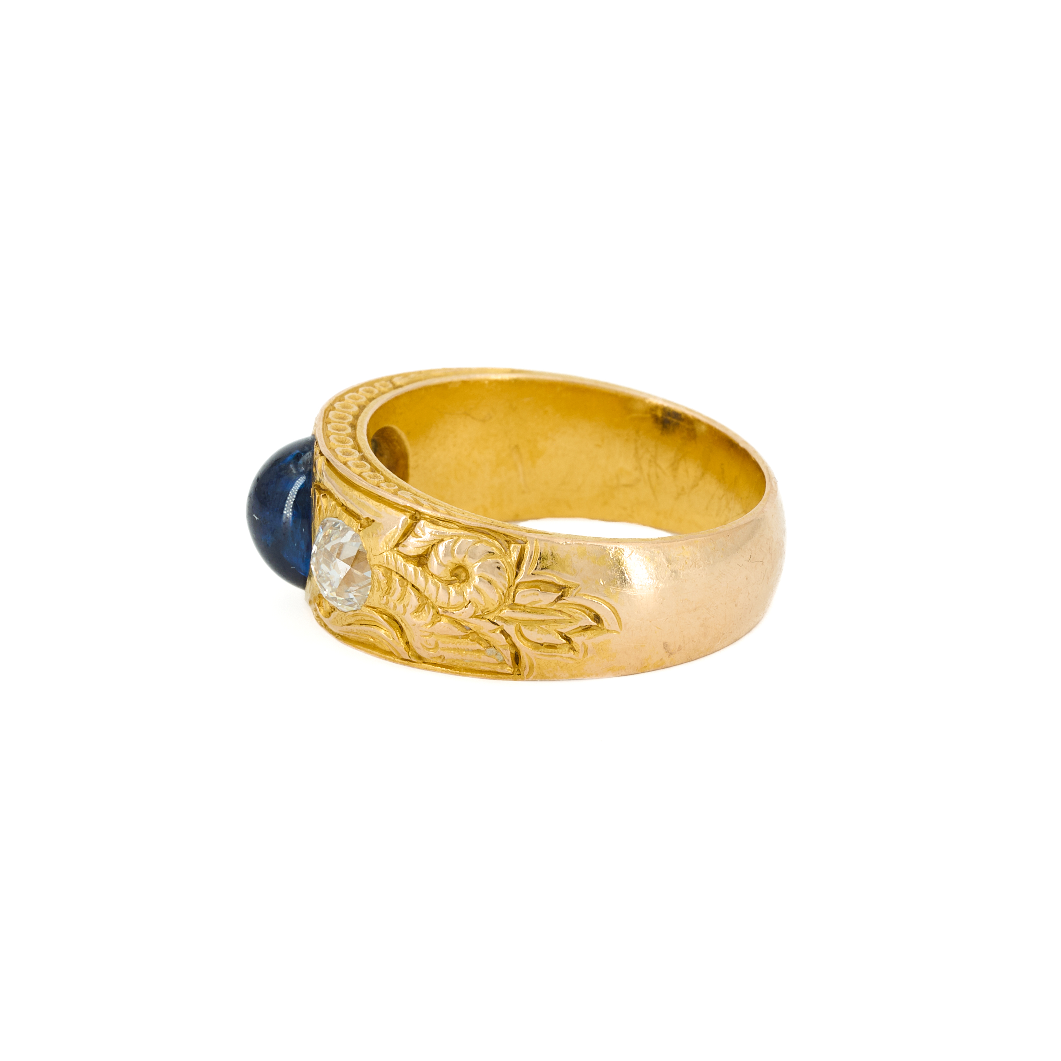 Saphir-Cabochon, flankiert von Altschliff-Diamanten.