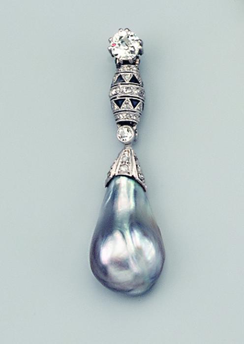950/000 Platin, Gesamtgewicht: 7,4gr. Anhänger Höhe 4,8cm. Zwölf gemischte schwarze und graue Caliedone im Triangelschliff53 winzige Diamantrosen und zwei Altschliff-Diamanten, zus. ca. 1,15ct.ein naturgrauer Orientperltropfen 23x13,6x8,6mm, ca. 7,42 Grains, Provenienz: Persischer Golf.