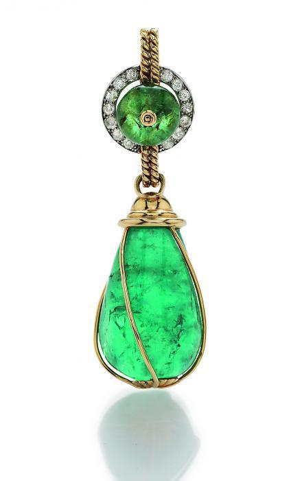 750/000 Gelbgold und Weißgold, Amtpunzen, Gesamtgewicht: 20,60gr. 6 x 1,6cm. 1 Smaragd-Tropfen im Cabochonschliff ca. 55,0ct., 1 Smaragd-Kugel ca. 6,0ct., Columbien14 Altschliff-Diamanten, zus. ca. 0,20ct.