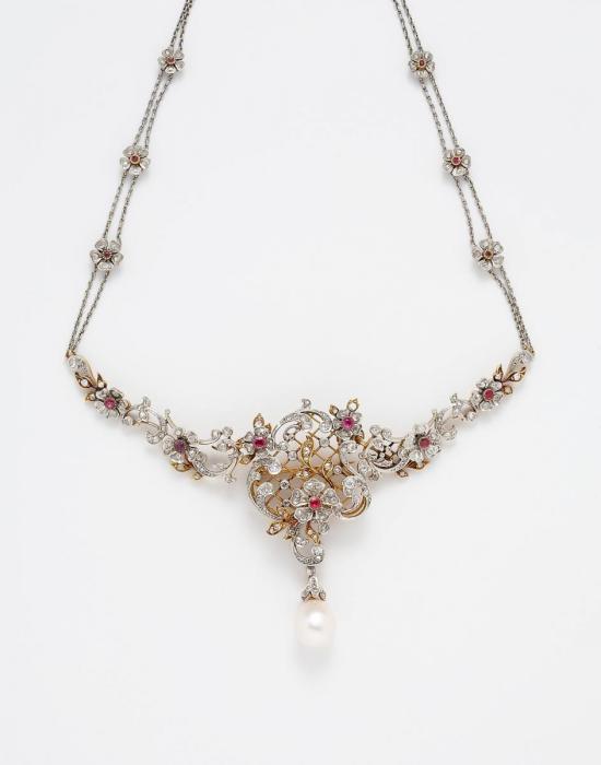 18ct yellow gold, silver, Gesamtgewicht: 47.6g. 41.0.cm long, brooch=6.2 x 3.1cm. 15 old-cut rubies appx.0.25ctabout 200 diamonds in old-and rose-cut appx.2.60ctone cultured pearl 12,33 x 10,37mm.
