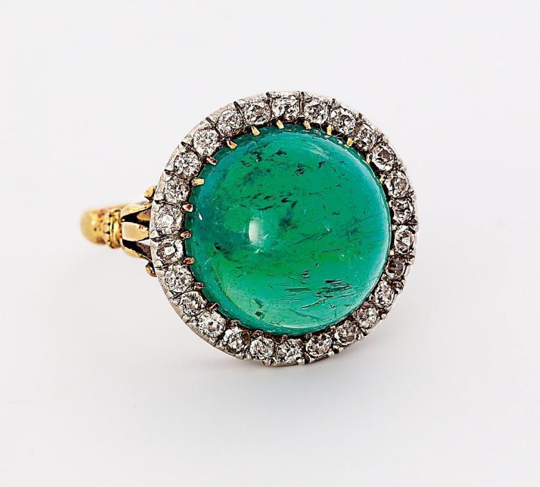 5,4g, EU-RM: 53. Ca. 27 kleine Altschliff-Diamanten zus.ca. 0,216ct Tchry-Chry (J-K)SI1 Smaragd Cabochon ca. 9,269ct, sehr gute Farbintensität750/- Gelbgold, mit Platinverbödung.
