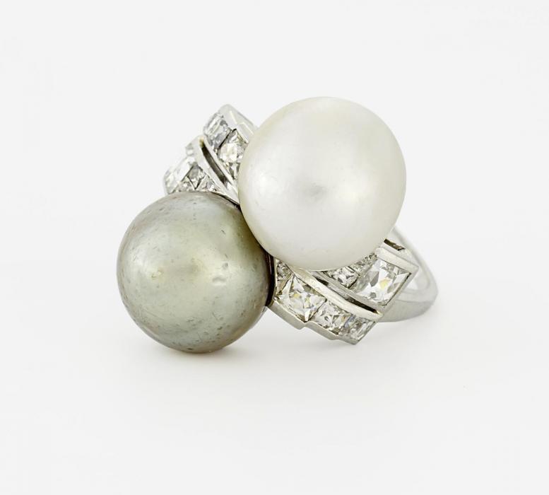750/- Palladium/Weißgold, Gesamtgewicht: 11,5g. EU-RM: 54. 10 facettierte Diamant-Karress zus.ca. 0,94ct Tchry(I-J)VS-SI, 6 winzige Diamantrosen1 Naturperle "Orient", wohl Bahrain, D. ca. 12,6-12,9 x 10,0mm, ca. 48,56grains, Körperf.: weiß, Überf.: weiß-zart cremé1 Salzwasser Naturperle D. ca. 11,8-12,1 x 9,9mm, ca. 38,28grains, Körperf.: silbrig grau, Überf.: gelblich-olive grün.
