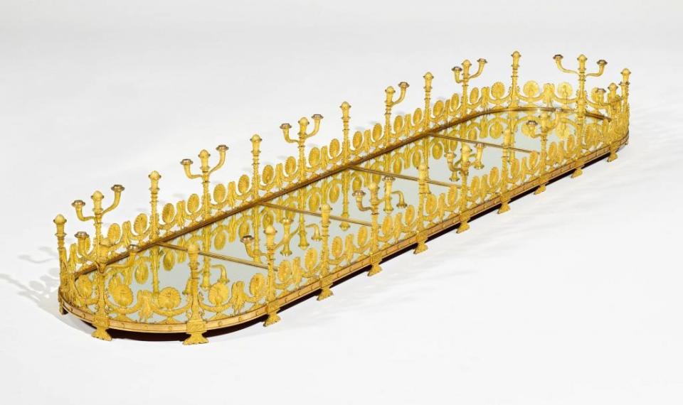 Dieser einzigartige Tafelaufsatz besticht nicht nur durch seine immense Größe, sondern vor allem durch den hochfeinen, aufwendig gearbeiteten, umlaufenden Bronzefries. Bis ins Detail gefertigte Pfauen, Genien und Girlanden mit üppigem Früchte- und Gemüsedekor präsentieren sich dem Betrachter ebenso eindrucksvoll wie die je zweiflammigen Leuchterarme und die in Widderköpfen gestalteten Füße.