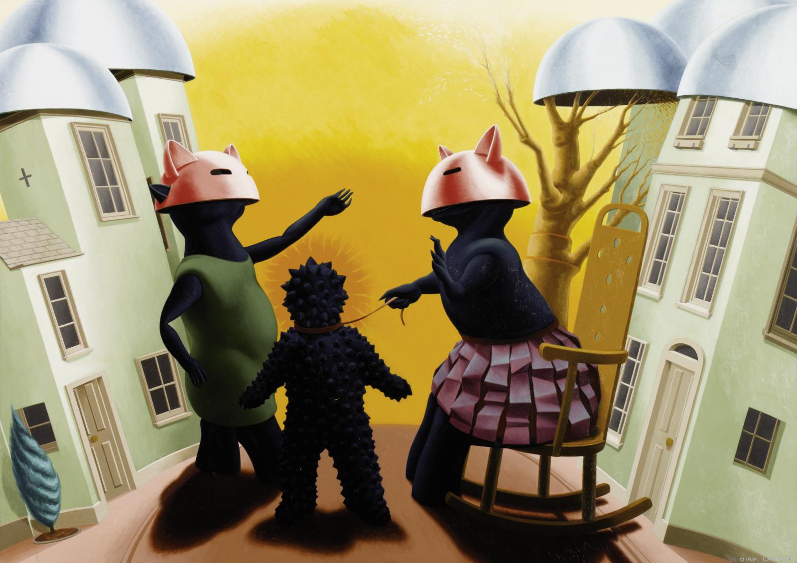 "Property owners discussing their pets". 1996. Öl auf Hartfaser. 74 x 103cm. Betitelt, signiert und datiert verso: Dirk Larsen '96.