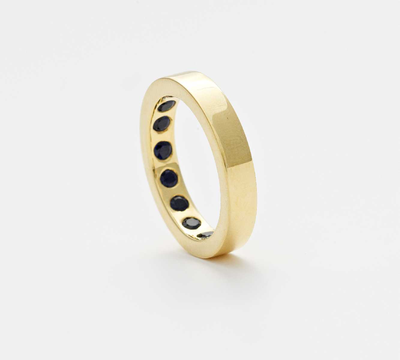 750/- Gelbgold, gestempelt. 10,9g. Ca.16 rund facettierte blaue Saphire, EU-RM: 62.