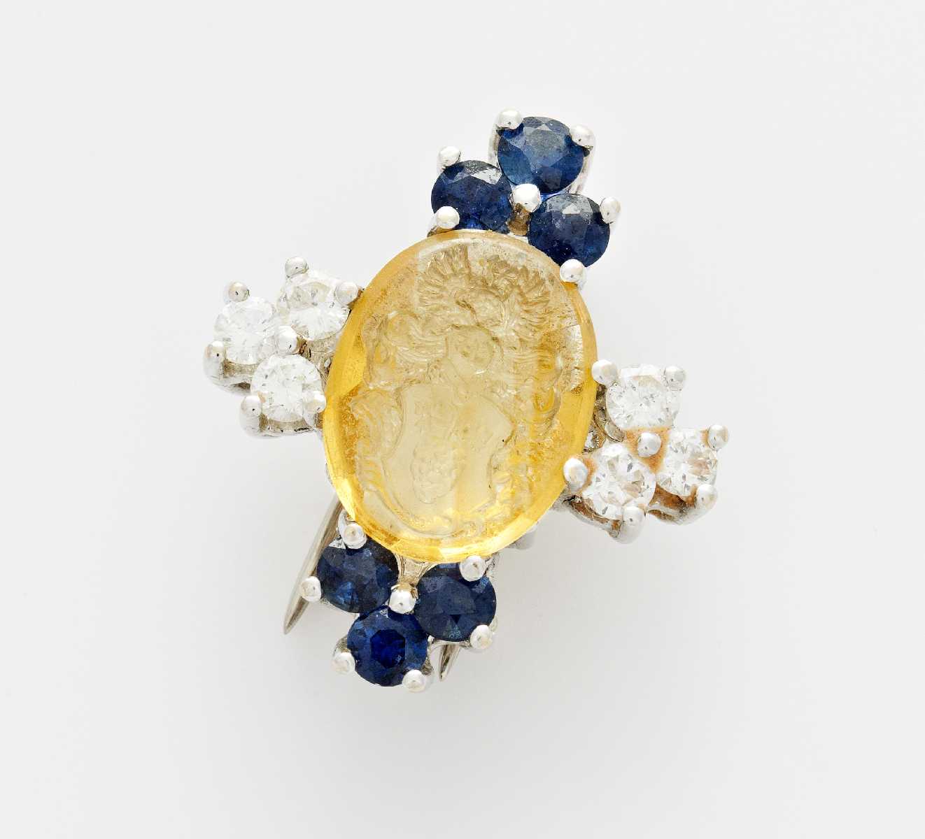 585/- Weißgold, gestempelt, Gewicht: 5g. 6 rund facettiert blaue Saphire ca. 1,08ct, 1 ovaler Citrin mit Intaglio-Wappenschnitt ca. 13,3 x 10,2mm, 6 Brillanten zus.ca. 0,48ct, H x B= 2,1 x 2,4cm.