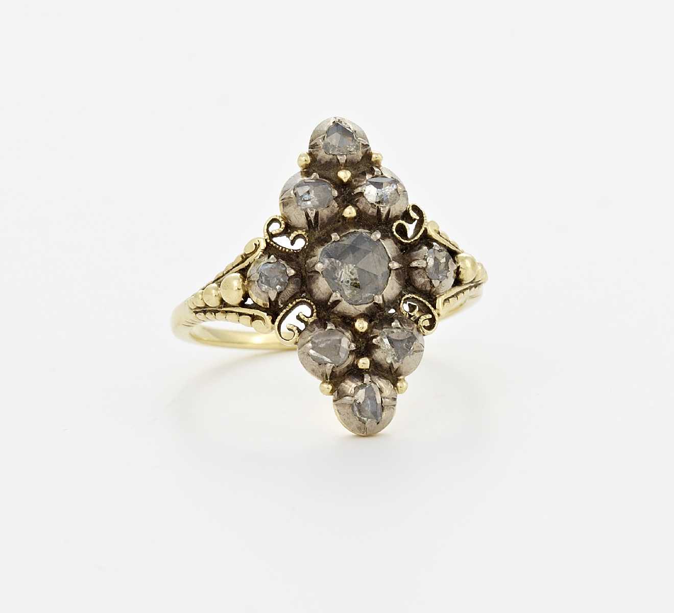 585/- Gelbgold, gestempelt, Silberverbödung, Gewicht: 3,8g. 9 folierte Diamantrosen, EU-RM: 53,5. Ringtop: H x B=19 x 12mm.