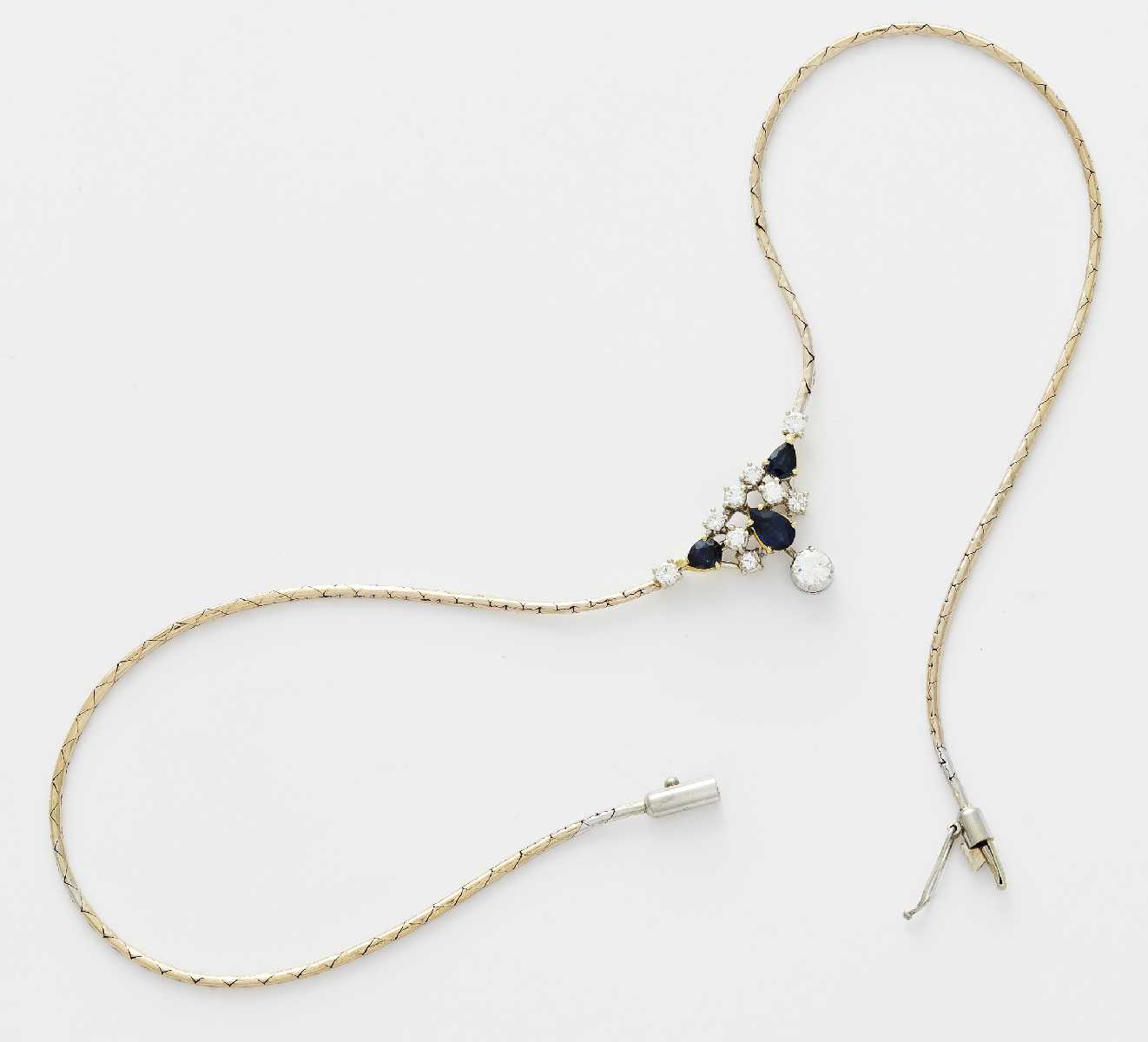 Gelbgold und Weißgold. 10,9g. 3 blaue Saphir-Tropfen ca. 0,78ct, 10 Brillanten zus.ca. 0,54ct, Halsweite: 37,5cm.~