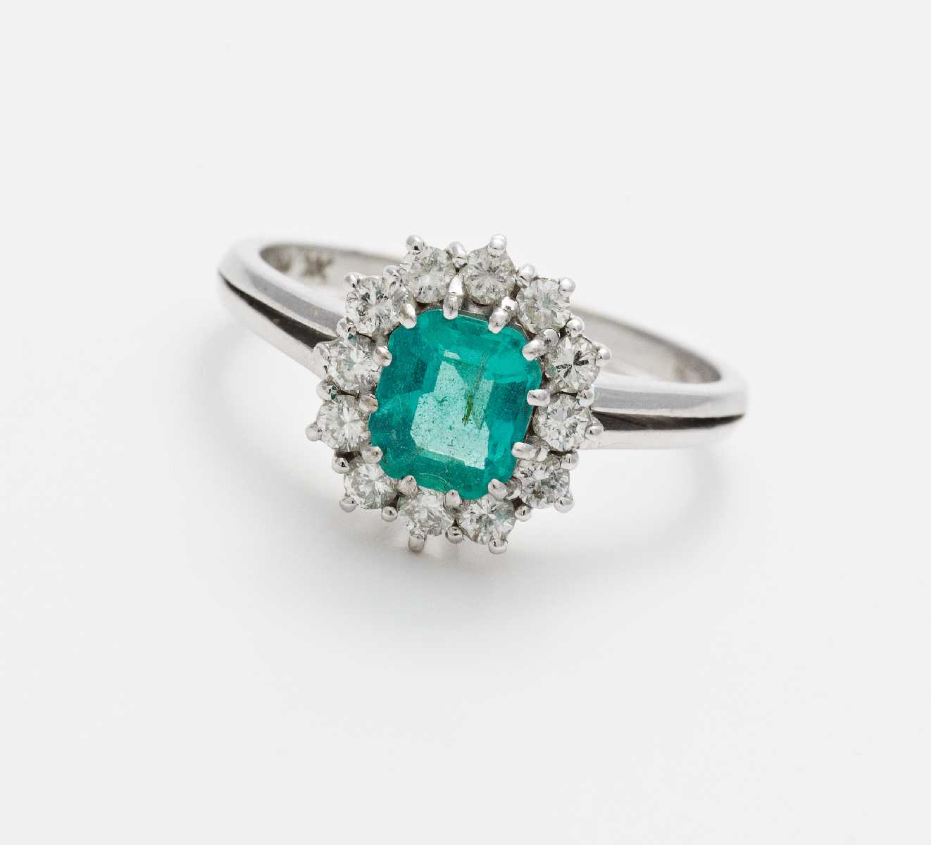 750/- Weißgold, gestempelt. 3,8g. 1 kissenförmig facettierter Smaragd D. 5 x 6mm, 12 winzige Brillanten, EU-RM: 56. Ringtop: D. 10 x 11mm.~