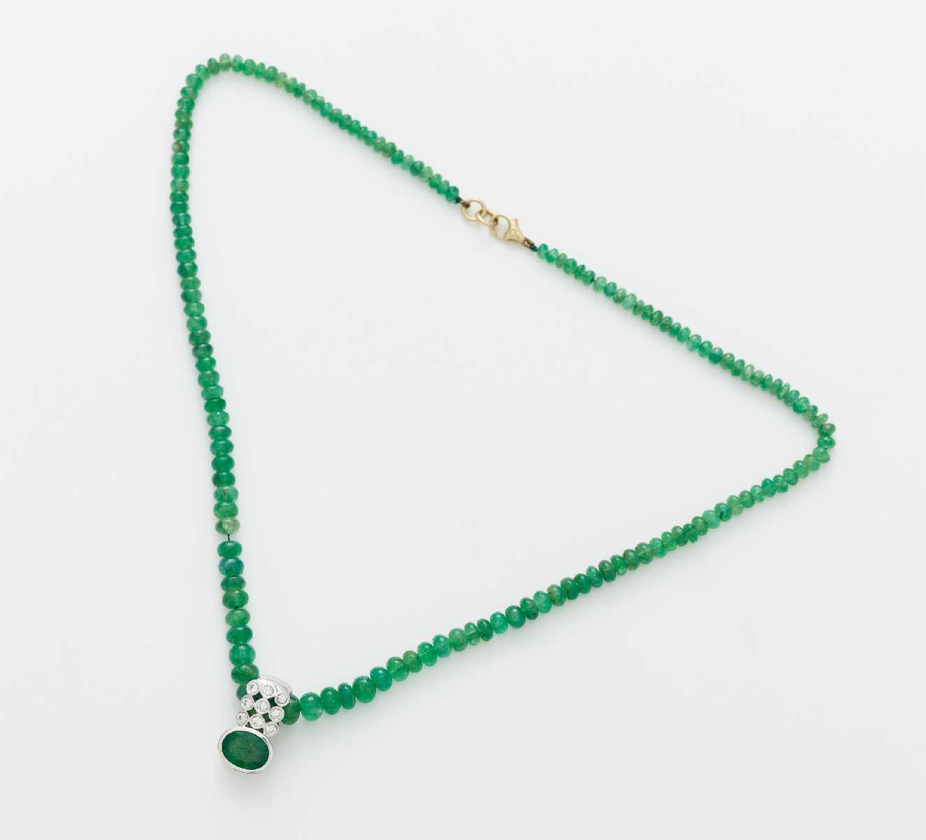 Verschluß. 585/- Gelbgold, gestempelt; Clipsanhänger: 585/- Weißgold, gestempelt. Kette: 11,0g; Anhänger: 6,1g. Kette: Vielzählige Smaragd-Buttons (verlaufend) D. 2-5mm, Anhänger: 1 oval facettierter Smaragd D. 6 x 9mm, 9 winzige Brillanten, Kette: 40,0cm lang; Anhänger: H x B=1,8 x 1,0cm.~