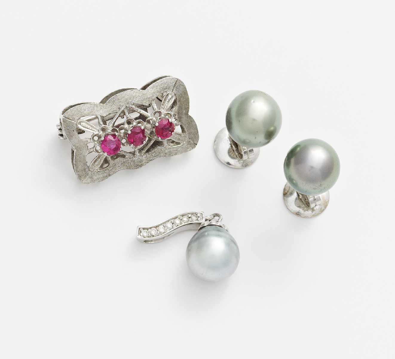 Brosche und Anhänger: 585/- Weißgold, gestempelt, Ohrstecker: 750/- Weißgold, gestempelt. Total: 9,7g. 3 rund facettierte Rubine, 7 winzige Brillanten, 1 barocker Tahiti-Zuchtperltropfen ca. 8,9 x 9,1mm, 2 runde Tahiti-Zuchtperlen ca. 9,5 - 9,6mm. Anhänger H= 2,6cm, Brosche H x B= 1,4 x 2,2cm.~