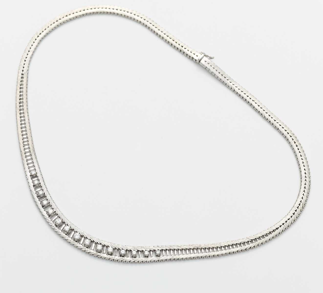 585/- Weißgold, gestempelt. 39,1g. 15 Brillanten, L x B=44 x 0,8cm (verlaufend).~